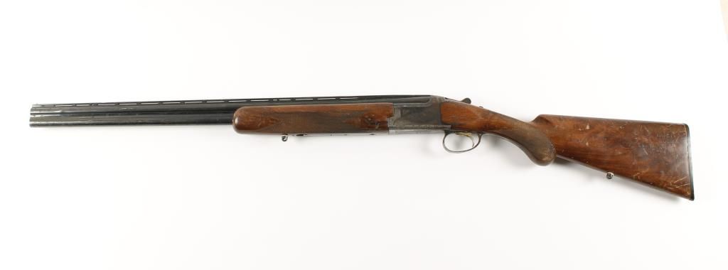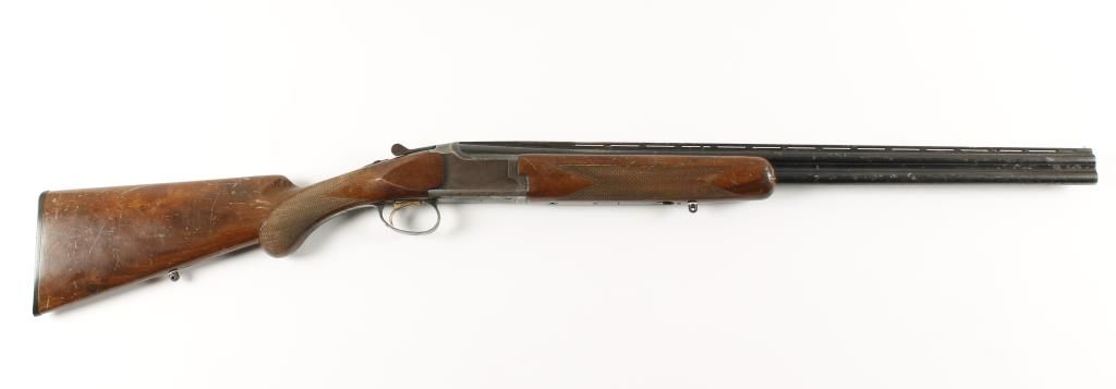 Over under double barrel shotgun with 26" vent rib barrels. Blued finish, checkered round-knob pistol grip walnut stock and forend, single select trigger, black plastic butt plate and sling swivel studs. Top barrel has bulge about 2" from end. Condition: Poor showing heavy use, light pitting throughout and wood shows dings, scratches and gouges. *Modern Firearm*