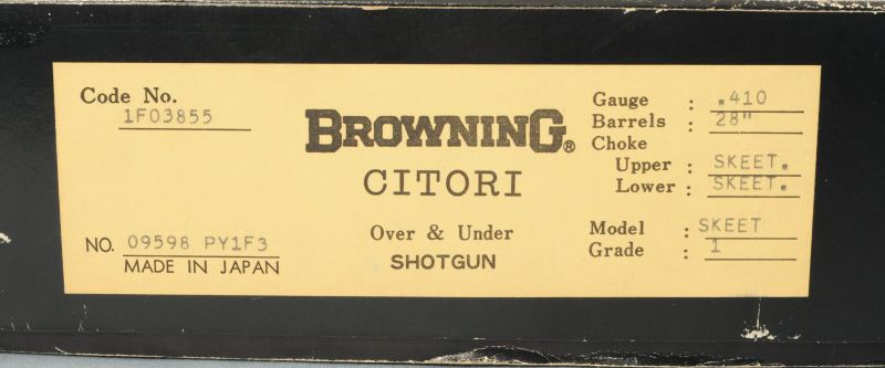 Browning Citori Over/Under .410 with Serial #09598 PY1F3 Unfired in the original plastic, new in the box. From the estate of the late Col. Billy Gregg from San Antonio, Texas.