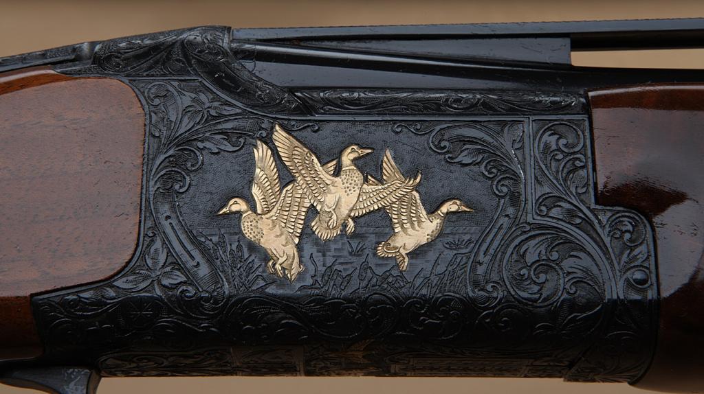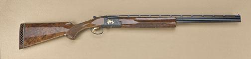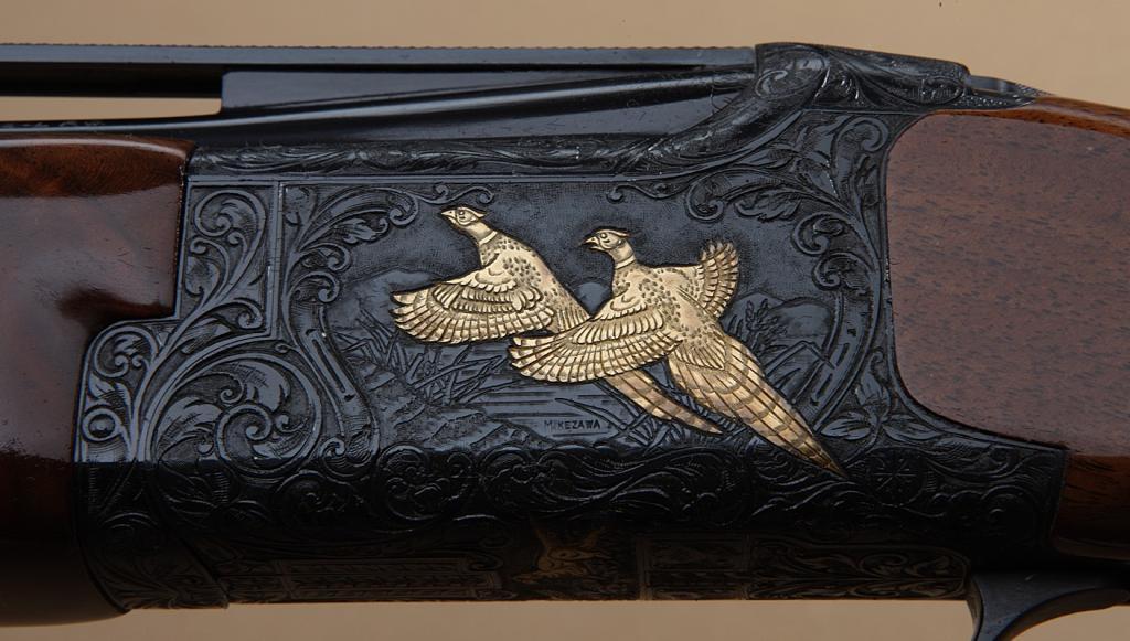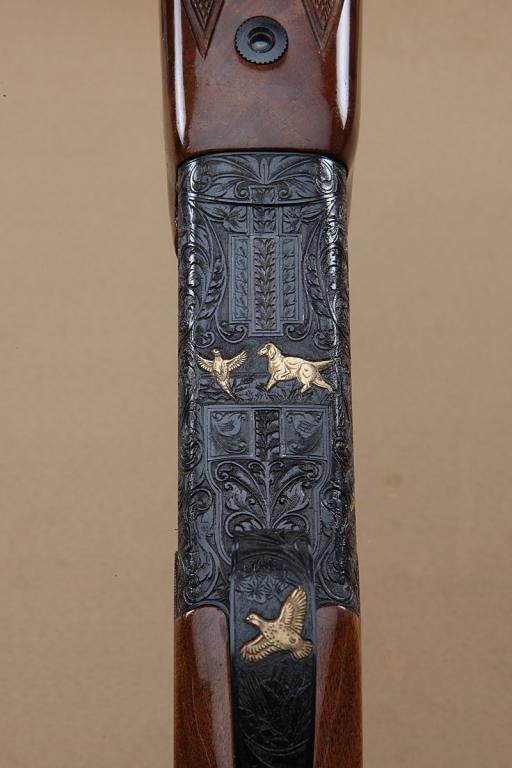 Browning Citori 410ga Superposed shotgun, 26” barrels, factory Skeet model, Skeet choked. Grade 6. Single trigger, auto ejector, raised ventilated rib, squared pistol grip, Browning recoil pad, serial #15102PX6F3.Shows later style engraving with game and scrolls, fancy checkered wood stocks. The stock measures 13-3/4” to the end of the wood, 14-3/4” to the end of the pad. Very good plus to near fine condition showing some slight use and a Browning repair order on end of box, probably for the addition of the buttplate. The high grade Citori’s in 410 are scarce. From the Robert Petersen collection. Est: $2,500 - $5,000