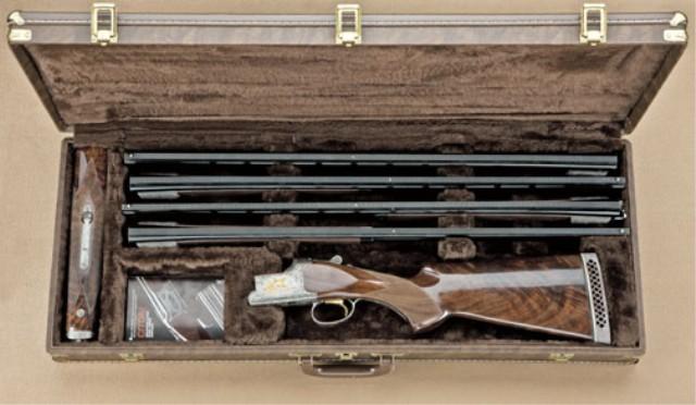 Browning Citori C-grade with gold set, 12, 20, 28, 410 gauges, serial #15562PN6A3. The gun shows single trigger, automatic ejector, 28” barrels, raised ribs, all Skeet choked. Fine to excellent condition. 98-99%, just some slight storage and minimal use. With browning luggage case. From the Robert Petersen Estate. Est: $1,500 - $3,000