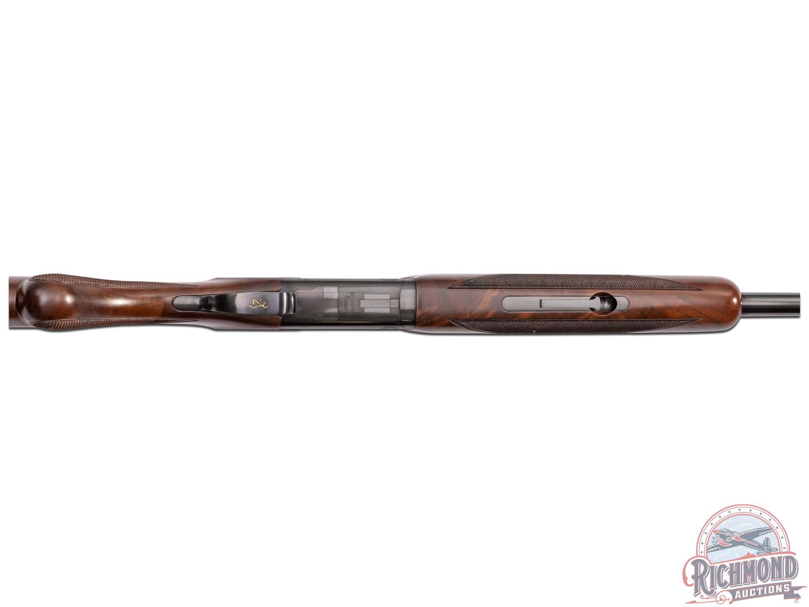 Manufactured in 1989. 28" blued Special Steel barrels with ventilated rib, ejectors, Hi-Viz front sight, Invector chokes, and Browning Utah address. Blued Grade I floral engraved action with top tang barrel selector, gold washed single trigger, and blued trigger guard with gold washed Browning Deer Head Logo. High grade figured walnut checkered round knob pistol grip stock with Browning hard rubber butt plate. Matching walnut sporting style forearm with "V" style checkering and latch release. LOP: 14". DAC: 1-1/2". DAH: 2". CALIBER: 16 GA. S/N: 23572MY131. FFL STATUS: Modern.