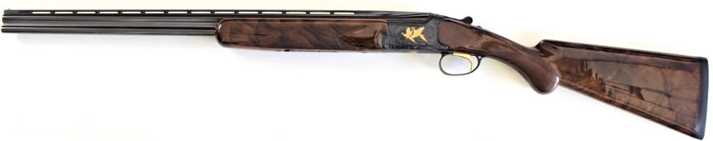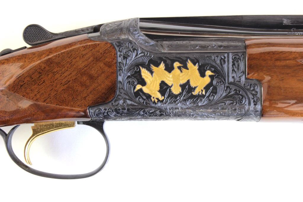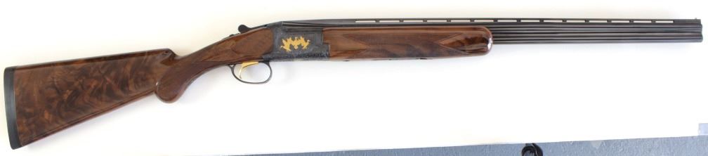Browning Citori Grade VI .410 SN 24412PP983 O/U shotgun with 26" vent rib barrels, remains fine with hand engraved blue receiver, features 2 gold inlaid birds on left and three on right, hunt dog on point of bottom and single bird on trigger guard. HighO/U shotgun with 26" vent rib barrels, remains fine with hand engraved blue receiver, features 2 gold inlaid birds on left and three on right, hunt dog on point of bottom and single bird on trigger guard. High figural walnut stocks are finelycheckered with high gloss finish fitted with Kick Eez rubber buttplad, LOP 14 1/2", DOC 1 1/2", DOH 2 3/8". From old St. Louis Collector. FFL/Modern. Est. 1500-2000