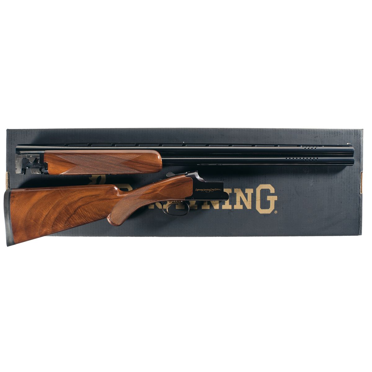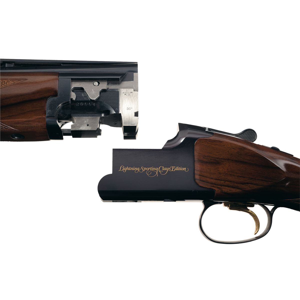 Features dual bead sight on a ported barrel, Invector Plus choke system, and auto ejectors. The action is marked in gold on both sides "Lightning Sporting Clays Edition". Equipped with a gold checkered trigger and tang safety. Fitted with a checkered forearm and pistol grip stock with a solid rubber recoil pad. Complete with original box numbered to gun, accessories box, and manual.