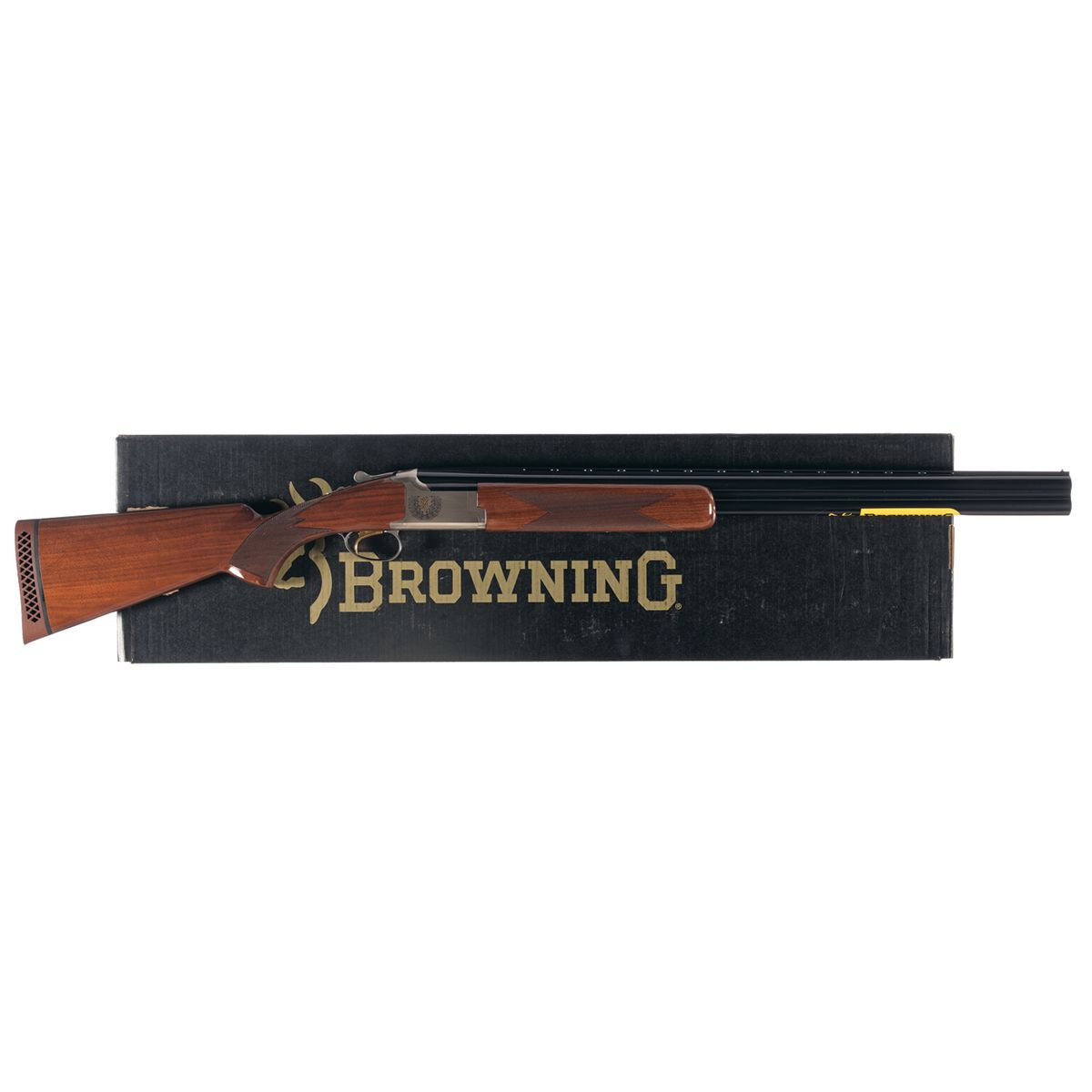 Manufactured by Miroku. Features a single bead sight on a matte vent rib, Invector choke system, 3 1/2 inch chamber, and auto ejectors. Standard barrel markings while the action has a gold inlaid Browning logo above a wreath on both sides. Mounted with a checkered forearm and pistol grip stock with ventilated Browning recoil pad. Complete with factory box numbered to gun that contains a choke tube and tool in accessories box, chamber locks and manual.