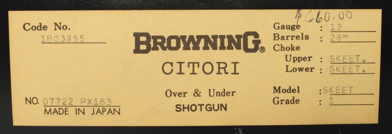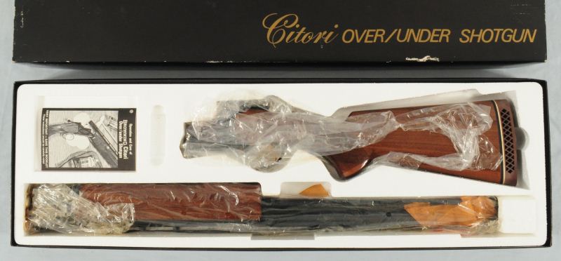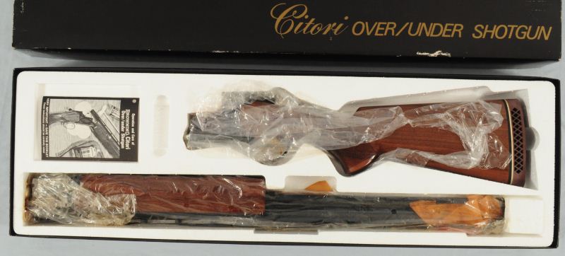 Browning Citori Over/Under .12 Ga Serial #07722 PX1B3 Unfired in the original plastic, new in the box. From the estate of the late Col. Billy Gregg from San Antonio, Texas. This & other Citoris were purchased from The Norfolk Navy Base at the Navy Exchange in 1983.