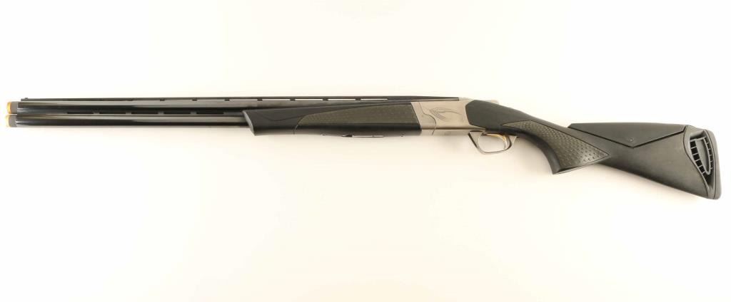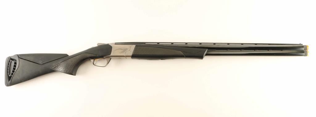Japanese over/under 12 gauge shotgun made by Miroku, imported by Browning Arms Company, Morgan UT. Markings indicate for 2.75 and 3 inch shells. Features approx 28 inch barrels that accept choke tubes, with ventilated rib, white bead front and mid rib beads. Stock and forend are black composite with contrasting gray rubber textured, pebble grained panels at wrist and forend; adjustable cheek piece, and ventilated recoil pad. Receiver is stainless, with Cynergy logos engraved on sides and bottom; Browning Buck engraved on sides and inlaid with gold color on triggerguard bow. Trigger has color gold accent. Manual safety appears to be a barrel selector style. Installed choke tubes are marked "D" (Diffuser) and "IC" (Improved), with "IC" tube showing marring around exit that appears to be from a choke tube wrench. Bores are excellent. Barrels are 95% with a few scratches along sides and a few dings on edges of the top rib. Receiver is excellent. Stock is very good or better with minor scratches and rub marks from use. Condition is NRA Excellent ***Modern Firearm***