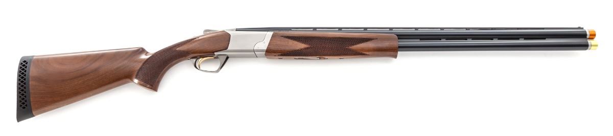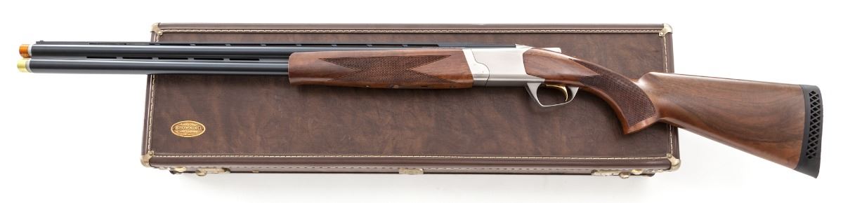 Browning Cynergy Field Grade Over/Under Shotgun, #05258MR132, 12 ga., 28'' vent rib blue barrels, 3-1/2'' chs., with four (4) Briley INVPXL Spectrum chokes, silver nitride finished receiver, checkered walnut stock and forend, with black Browning rubber butt pad. In somewhat earlier Browning luggage case. Condition is excellent showing only the lightest marks from handling, and most likely unfired. Est.: $1,500-$2,000. (Modern)