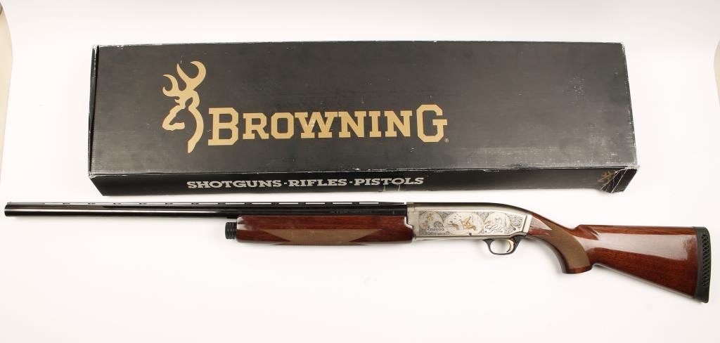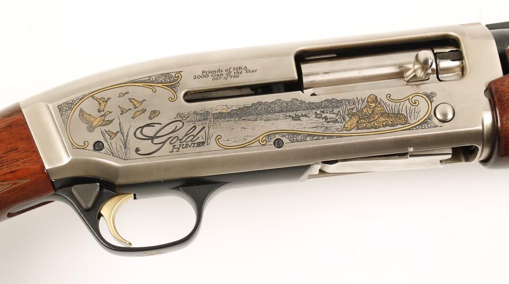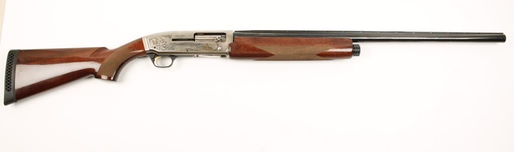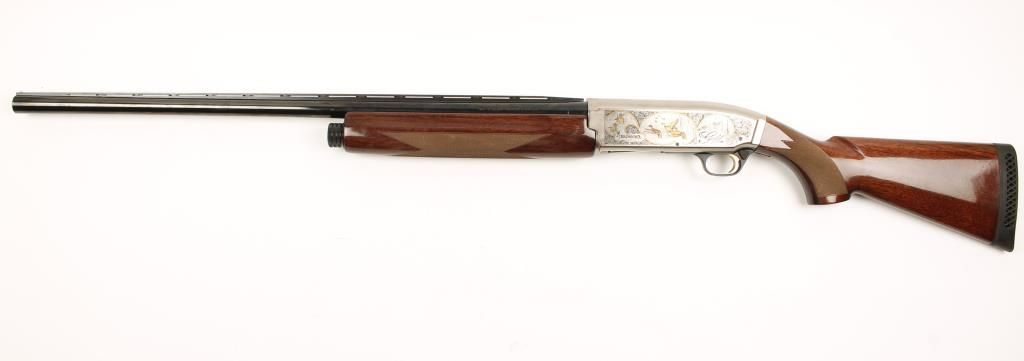 Beautiful semi auto shotgun with 28" vent rib barrel with Invector chokes. Silver receiver with scroll engraving and hunting scenes, checkered pistol grip walnut stock and forend with rubber recoil pad. Friends of the NRA GUN OF THE YEAR IN 2000. Excellent bore and action. Includes original box, manual, choke wrench and 3 chokes. Condition: Near perfect. *Modern Firearm*