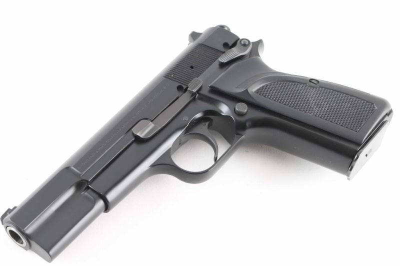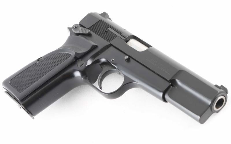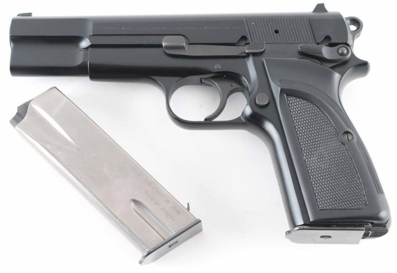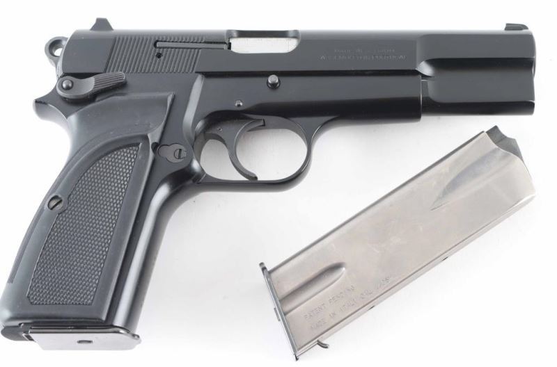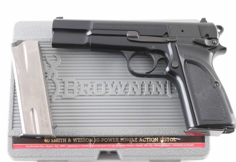Out of production single action semi-automatic pistol chambered in 9x19mm manufactured in Portugal with Belgium made parts circa 1993. Features a matte black epoxy finish, 4 5/8" barrel, dovetailed thee-bar sights, external extractor, smooth trigger, serrated hammer spur, ambidextrous safety/slide catch on the frame, magazine disconnect safety, push button magazine release, 10 round magazine with ejection spring, steel frame and two-piece checkered black synthetic grips. Includes a factory hard case with documents and spare magazine. Pistol exhibits approximately 99% of it's original finish showing no real signs of wear or handling. Action is smooth, the bore appears excellent and the synthetic grips are fine. NRA Excellent Modern Firearm