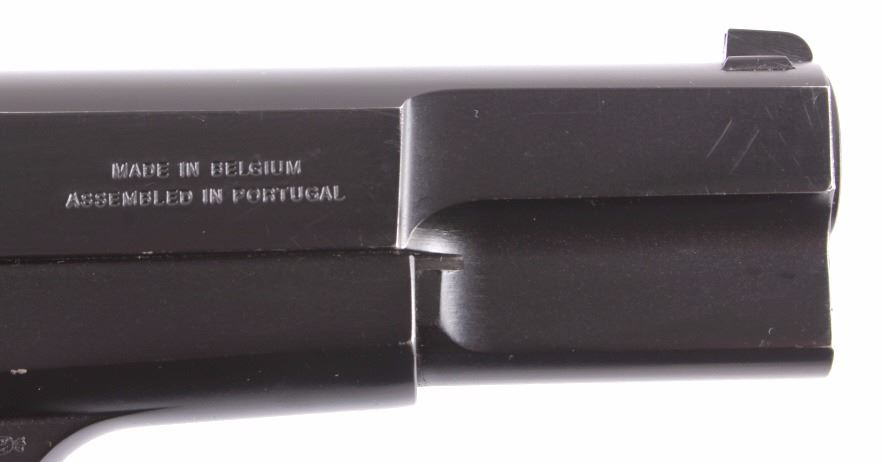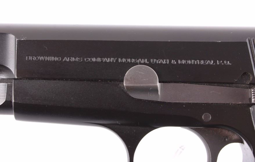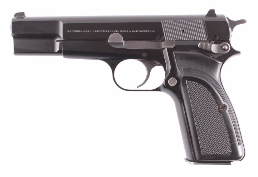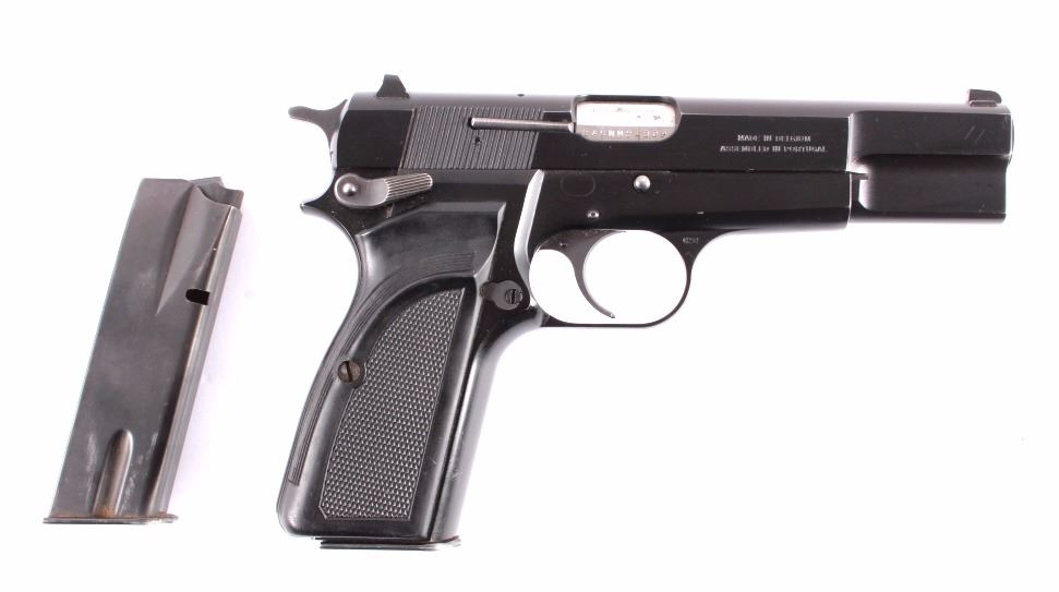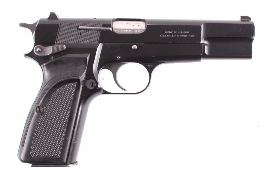This is a Browning Hi Power semi-automatic pistol chambered in the 9mm Luger caliber manufactured in 1990. The pistol features a blued slide and frame with checkered grips. The barrel is marked "Browning Arms Company Morgan, Utah & Montreal, P.Q." and "Made in Belgium / Assembled in Portugal". The pistol comes with two magazines. The Browning Hi Power pistol shows very good condition with 98% finish. The pistol measures 7.75" long overall. Serial number is 245NM24309 and was manufactured in 1990. This is a modern manufactured firearm and requires an FFL or NICS background check to transfer.