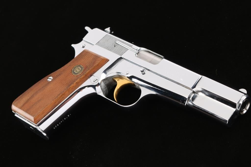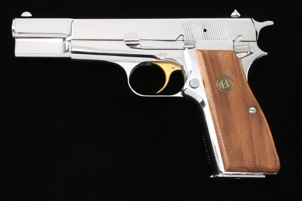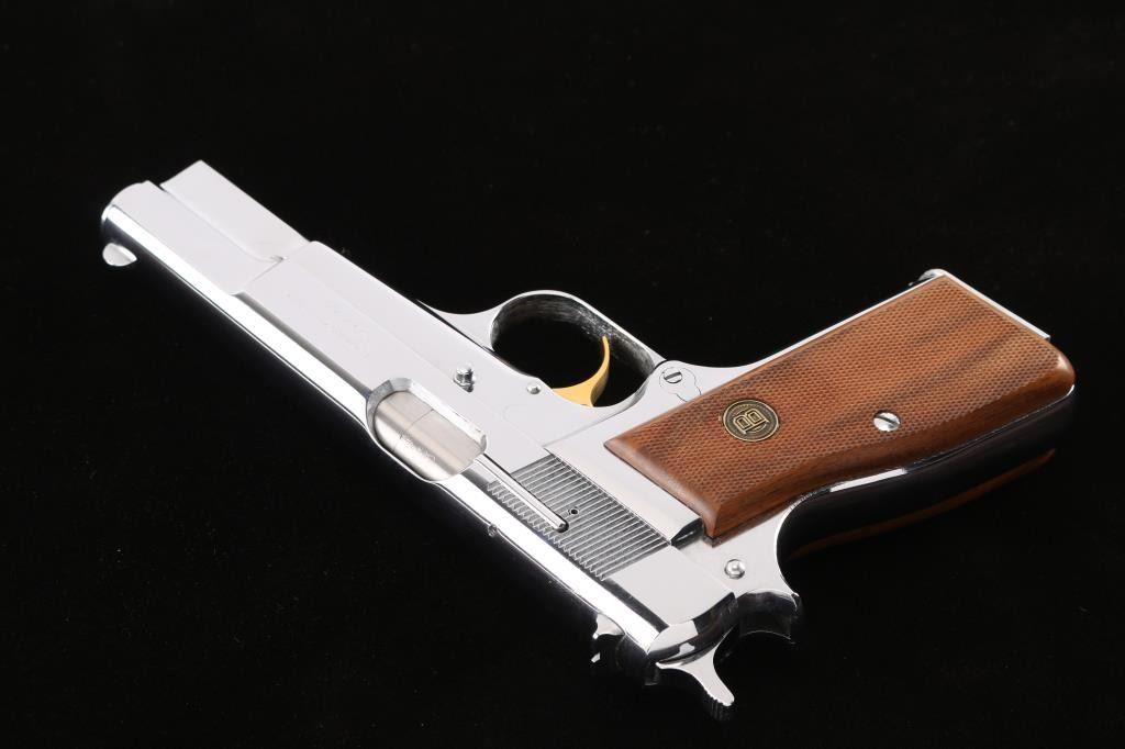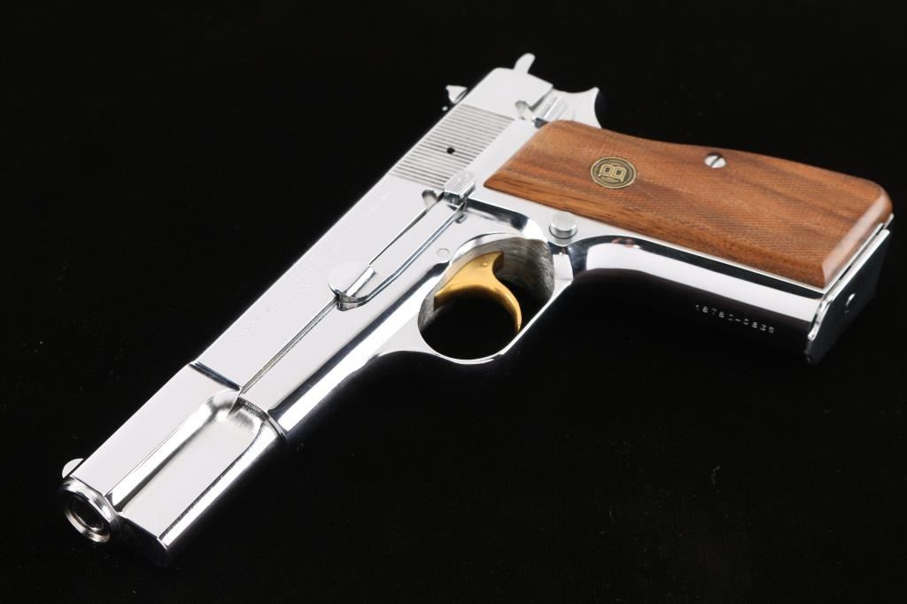 Limited edition Centennial of 3500. Marked: "BROWNING CENTENNIAL" over "1878-1978" on the right side of the slide. High polish silver chrome finish, gold toned trigger, fine checkered wood grips with Browning medallions. Chrome magazine. Standard Hi power features. Bore is pristine, pistol is in like new condition. No case.