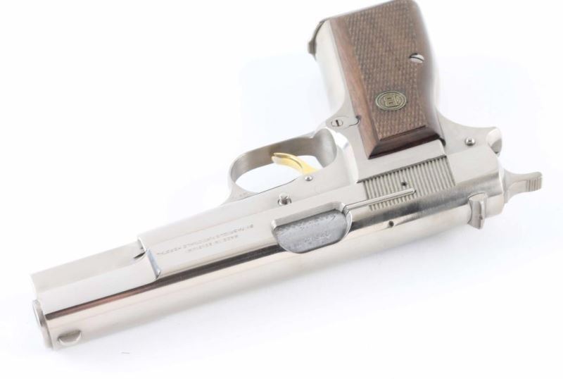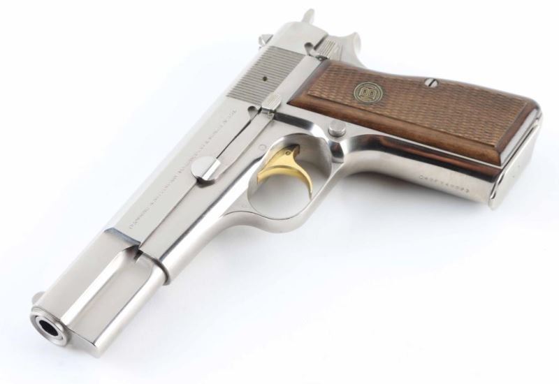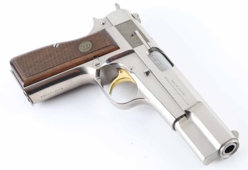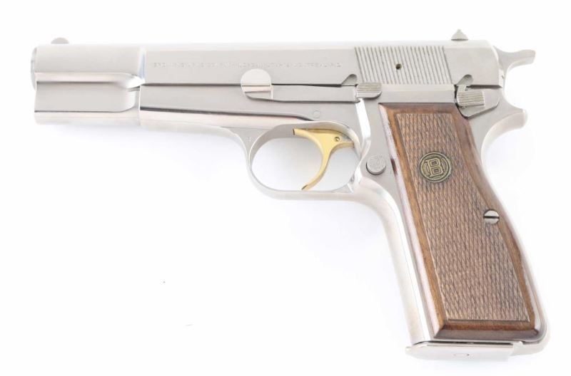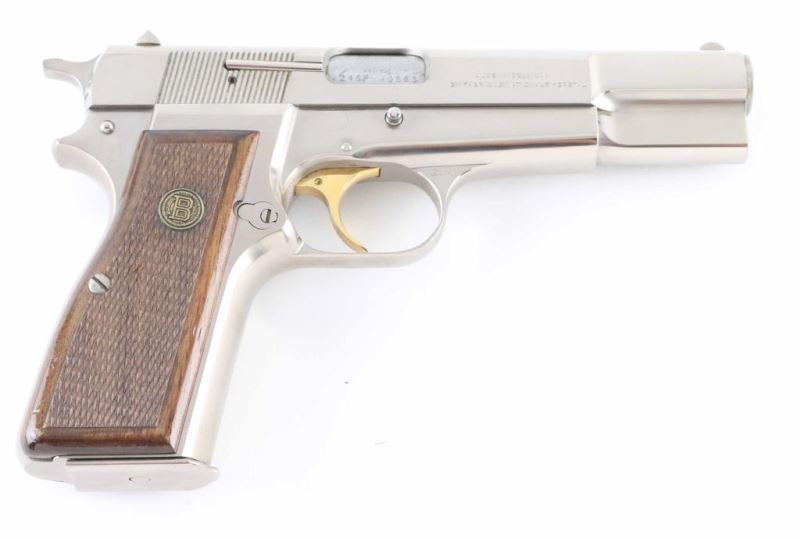 Belgian single action semi-automatic pistol manufactured circa 1982, imported by Browning Arms, Morgan UT. Features a polished nickel finish, 4 5/8" barrel, fixed blade front sight, square notch rear sight in dovetail, smooth gold color accent trigger, serrated hammer spur, frame mounted manual safety, magazine disconnect safety, push button magazine release, two-piece checkered walnut grips with "B" medallions. Bore is very good condition. Nickel finish is very good condition, many small scratches with no visible flaking or peeling. Trigger retains majority of gold color, with rubbing wear. Grips are very good. Includes (1) magazine. Condition is NRA Very Good++ *** Modern Firearm ***
