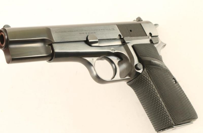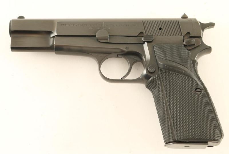 Belgium made single action semi-automatic pistol chambered in 9mm, circa 1979. Features blued finish, 4.75" barrel, round blade front sight, dovetailed rear window sight, smooth trigger, serrated hammer spur, push button magazine release, 13 round magazine, thumb safety, steel frame and two-piece Pachmayr Signature checkered black rubber target style grips. Pistol exhibits approximately 98% of it's original blued finish showing very little wear and a scratch on the slide from the take-down lever. Action is smooth, bore is pristine and rubber grips are fine. Condition is excellent. ***Modern Firearm***