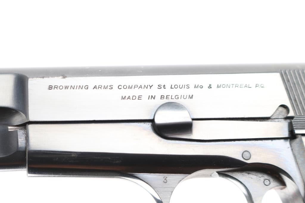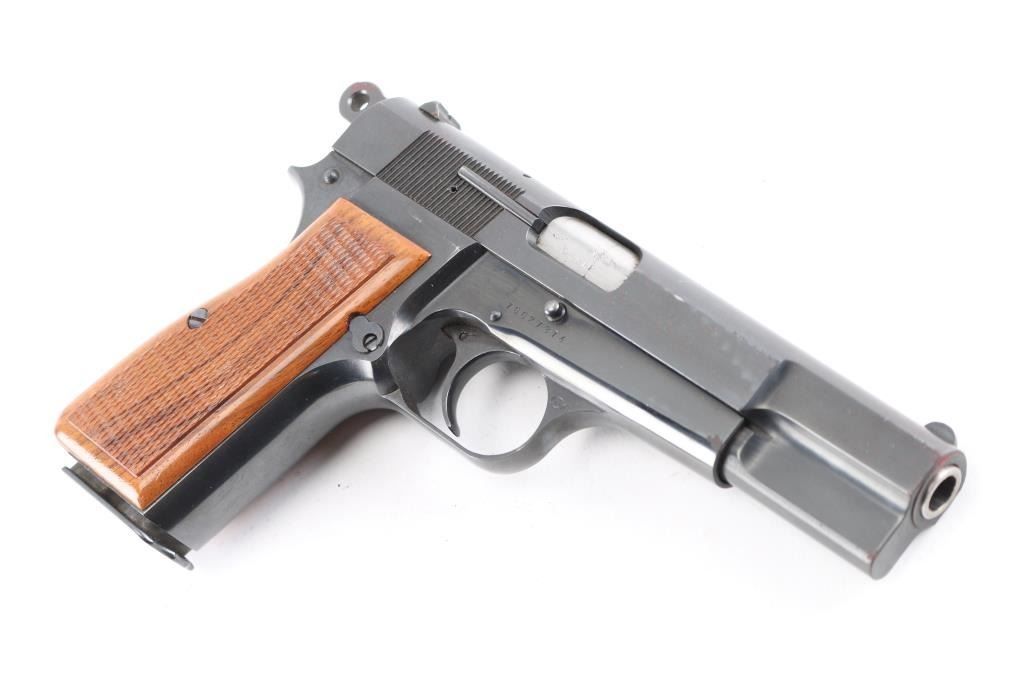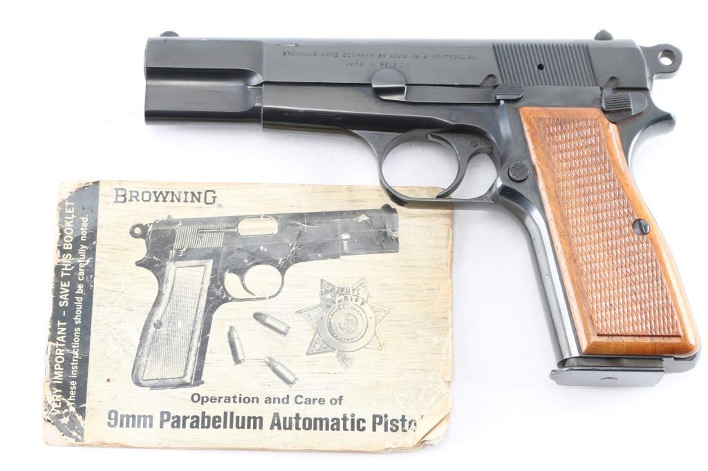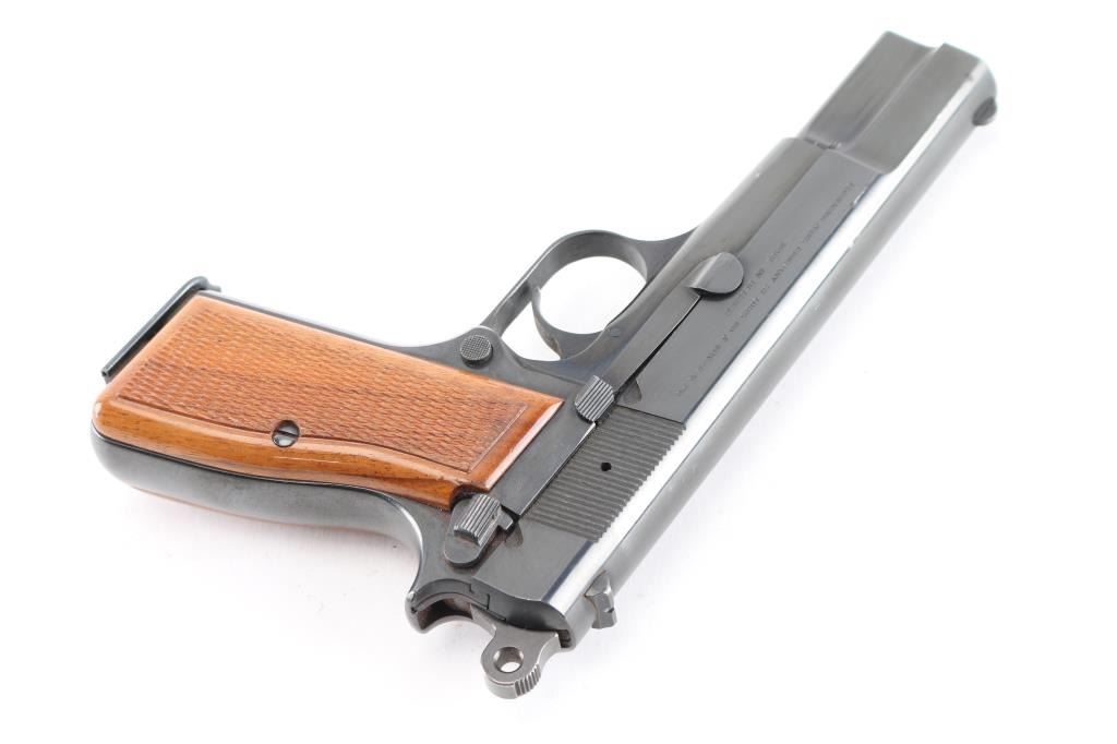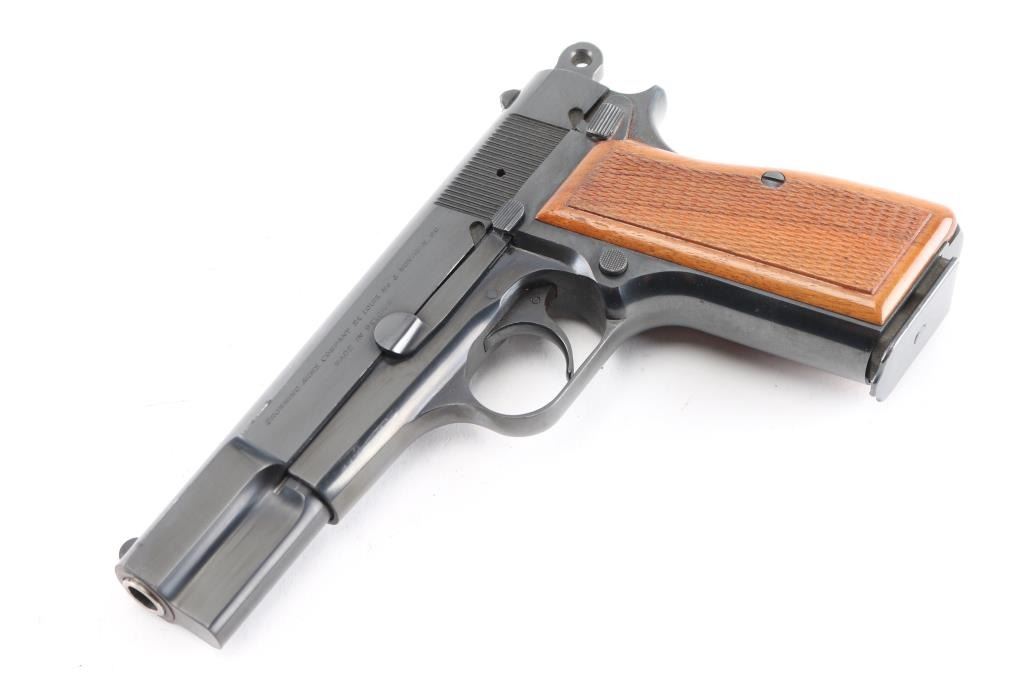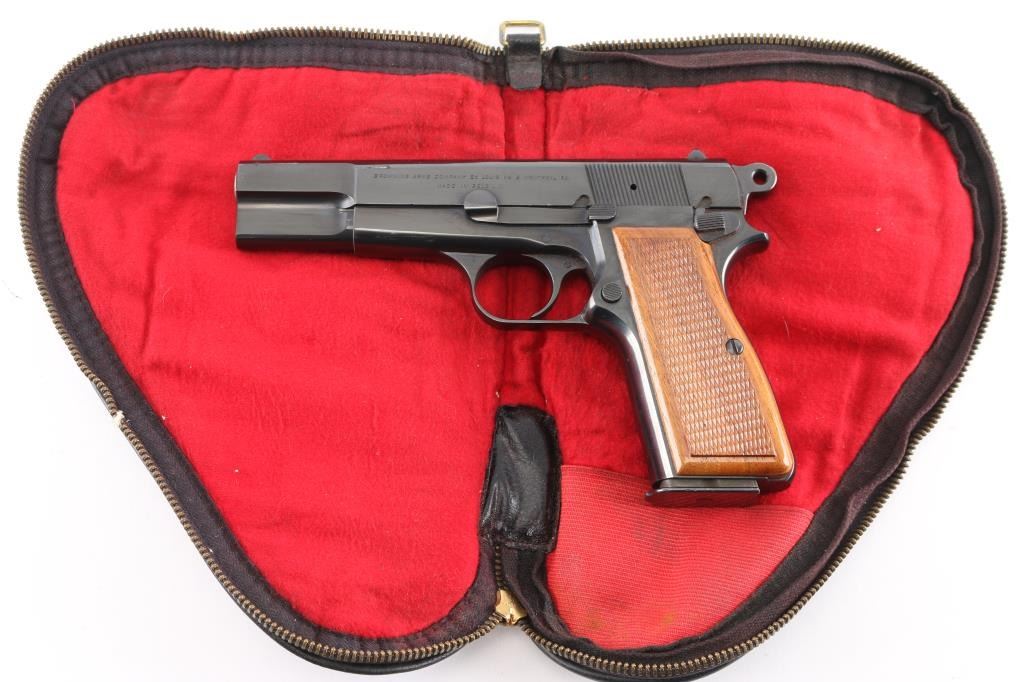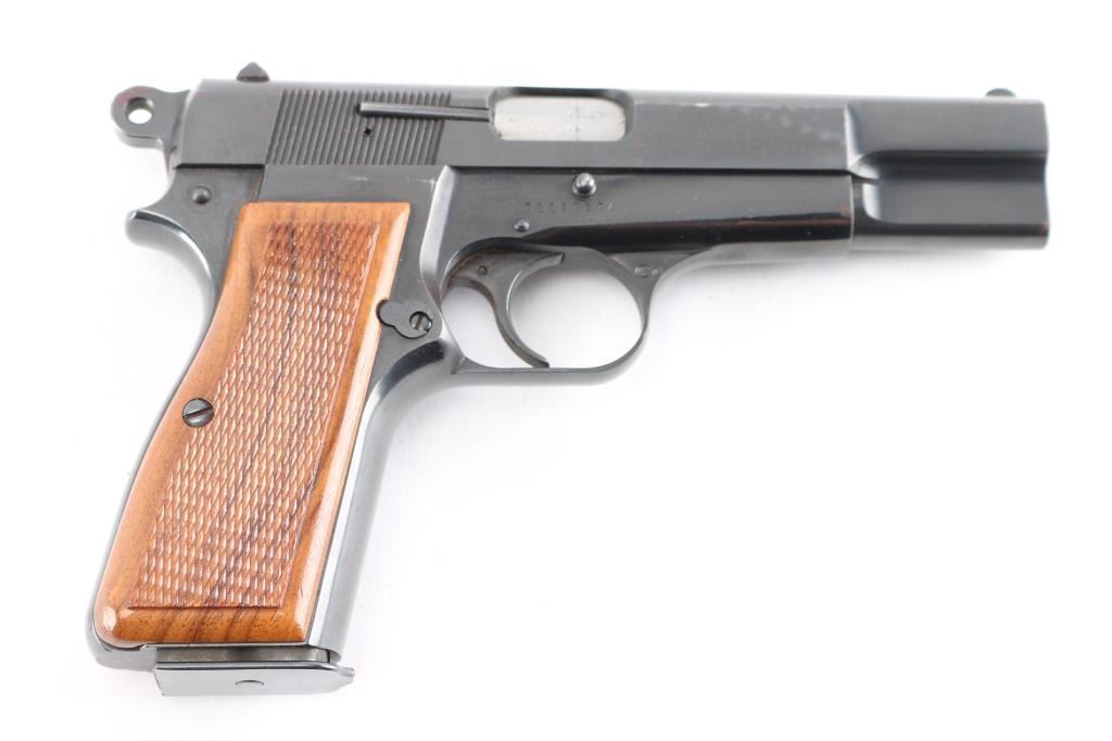 Desirable single action semi-automatic pistol chambered in 9x19mm, manufactured in Belgium by Fabrique Nationale circa 1970. Features a blued finish, 4.75" barrel, internal extractor, round blade front sight, dovetailed rear sight with ‘u’ notch, smooth trigger, serrated rowel hammer spur, manual safety/slide catch on the left side of the frame, push button magazine release, 13 round magazine, steel frame and two-piece checkered walnut grips. Pistol retains approximately 95% of its original finish showing very minor scratches/rubs, slight edge wear. Action is smooth, the bore is excellent/bright and the grips are excellent. Comes with original manual. In soft case.