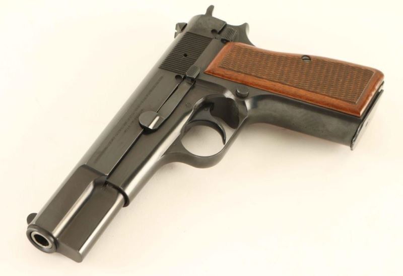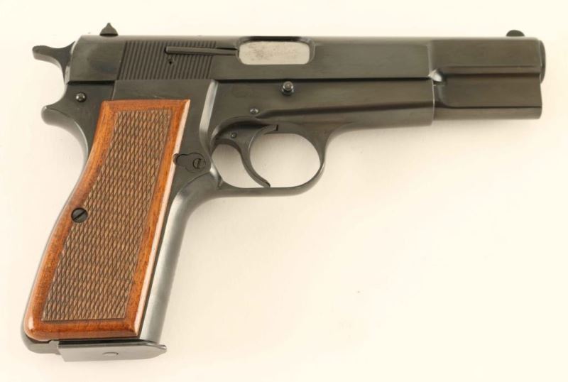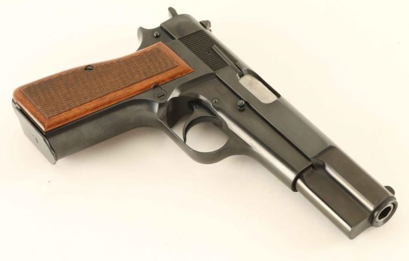 Belgium made single action semi-automatic pistol chambered in 9x19mm, manufactured circa 1976. Features a blued finish, 4.75" barrel, round blade front sight, dovetailed square notch rear sight, smooth trigger, serrated hammer spur, manual safety on the left side of the frame, push button magazine release, 13 round magazine, steel frame and two-piece checkered walnut grips with red painted backs. Pistol exhibits approximately 96% of it's original blued finish with some light handling marks/scratches and small amount of scattered oxidation. Action is smooth, the bore is pristine and wood grips are fine. Condition is near NRA Excellent. ***Modern Firearm***