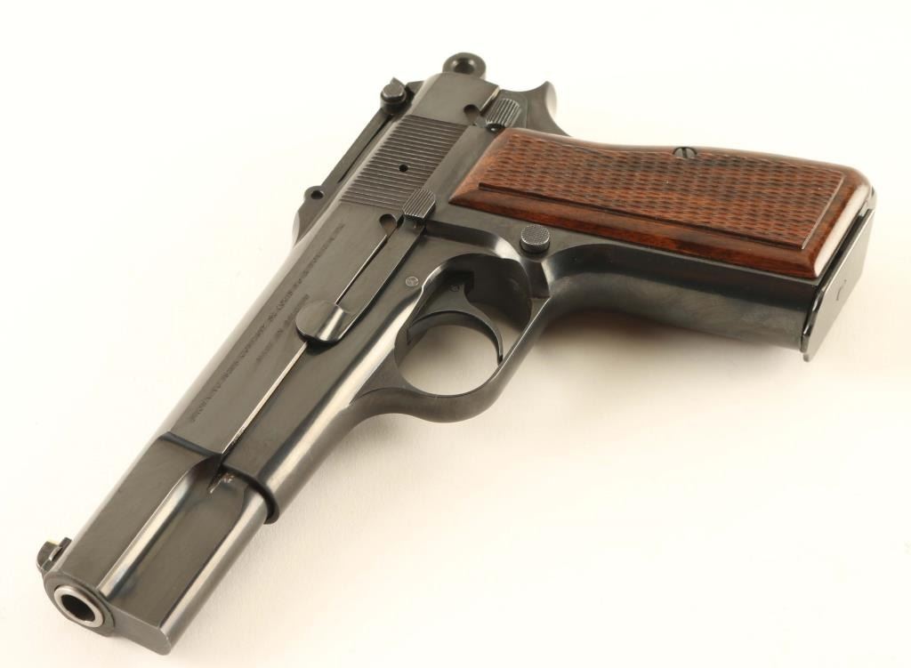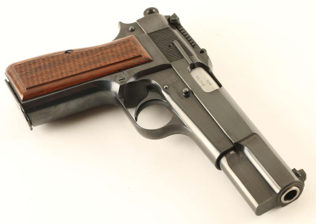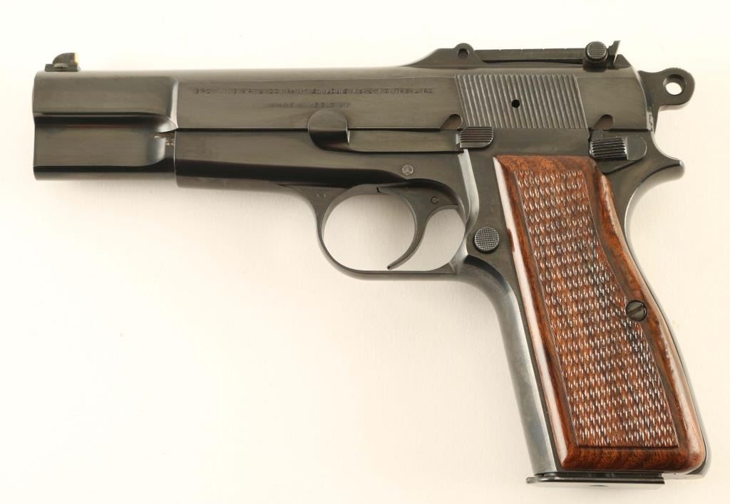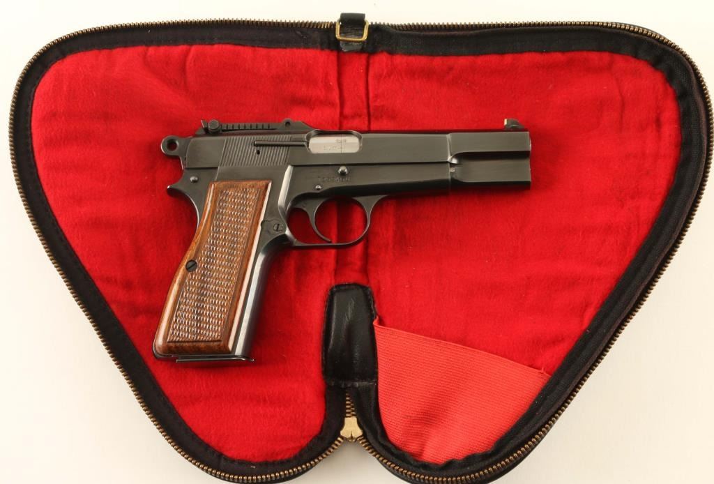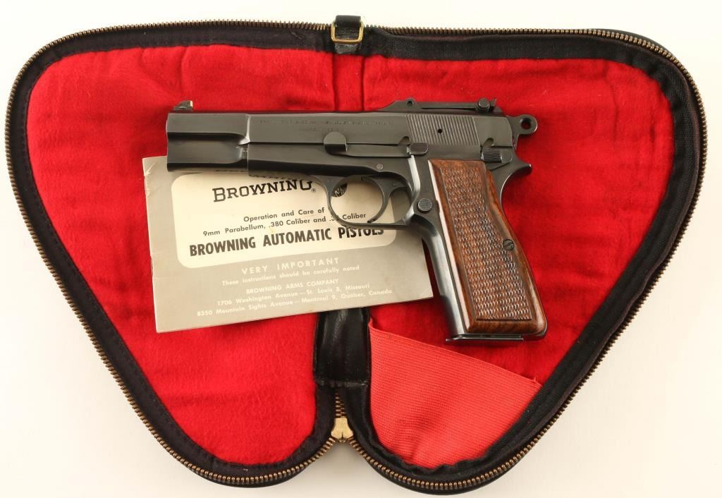 ‘T Series, Tangent Sight’ Desirable single action semi-automatic pistol chambered in 9x19mm, manufactured in Belgium by Fabrique Nationale circa 1969. Features a blued finish, 4.75" barrel, external extractor, dovetailed blade front sight with white accent, tangent rear sight graduated to 500 meters, smooth trigger, serrated round hammer spur, manual safety/slide catch on the left side of the frame, magazine disconnect safety, push button magazine release, unmarked 13 round magazine, steel frame and checkered walnut grips with red painted backs. Includes a factory zippered soft case with manual. Pistol retains approximately 99% of its original blued finish showing only minor scratches. Action is smooth, the bore is pristine and wood grips are fine. Condition is near NRA Perfect. ***C&R Firearm***