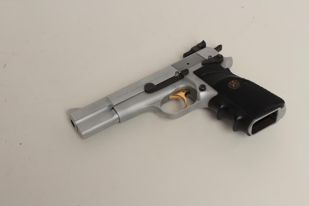 3.75” barrel, satin finish, gold trigger, wrap around Pachmayr hard rubber grips, no magazine, S/N 245NZ58985, in overall fine + condition with a fine bore, crisp action, sharp markings and fine grips. (Modern/PPT). Est.: $600-$1,200.