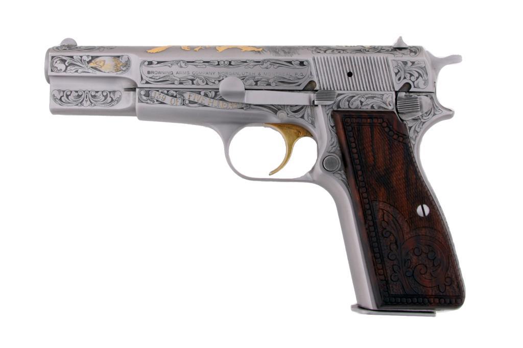 Browning Hi Power "Gold Classic" Cal 9mm SN:245GC139 Number 139 of 500 single action Hi Power pistols engraved with eagle motifs and floral designs. Matte silver finish with gold wash designs, checkered wood grips with floral design, 5" barrel, fixSN:245GC139 Number 139 of 500 single action Hi Power pistols engraved with eagle motifs and floral designs. Matte silver finish with gold wash designs, checkered wood grips with floral design, 5" barrel, fixed sight, good bore and action.Condition: Very good and has been fired. A little of the gold wash has worn off at the muzzle. Included is a brown leather holster and extra magazine.