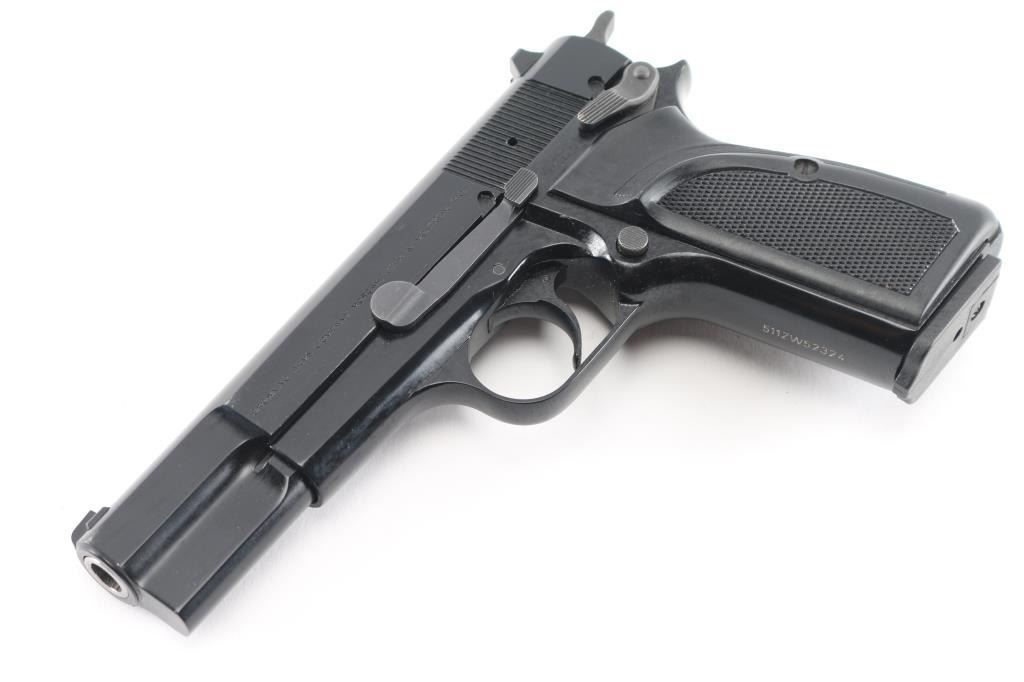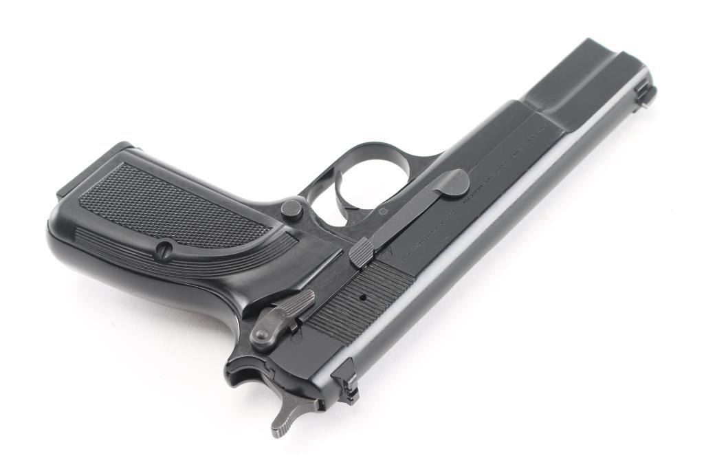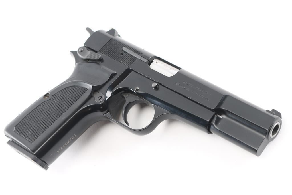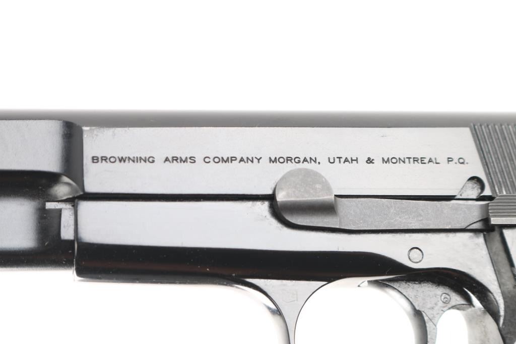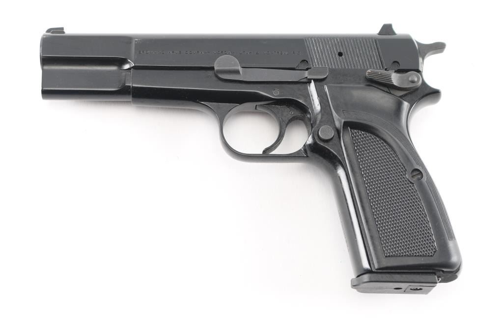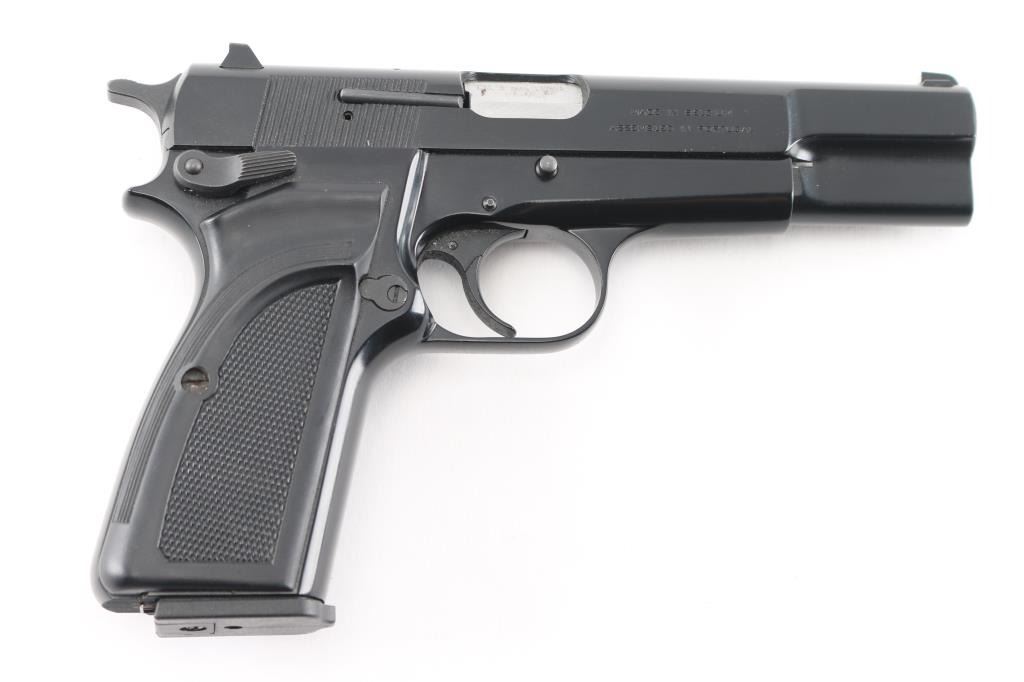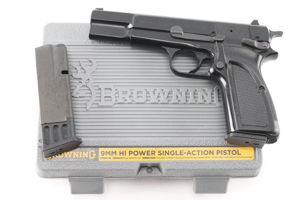 elgian single action semi-automatic pistol, assembled in Portugal circa 2014, imported by Browning Arms, Morgan UT. Features matte black finish, 4 5/8" barrel, white ramped blade front sight & square notch rear sight in dovetails, smooth trigger, serrated hammer spur, frame mounted manual safety, magazine disconnect safety, push button magazine release, black plastic checkered grips with finger rests. Condition is like new. Bore is pristine. Includes (2) 10-rd magazines, factory hard case, manual.Condition is NRA Excellent. Modern Firearm.