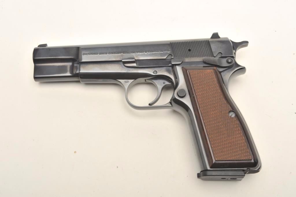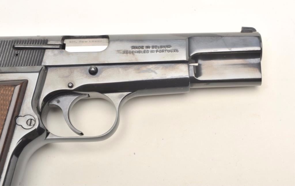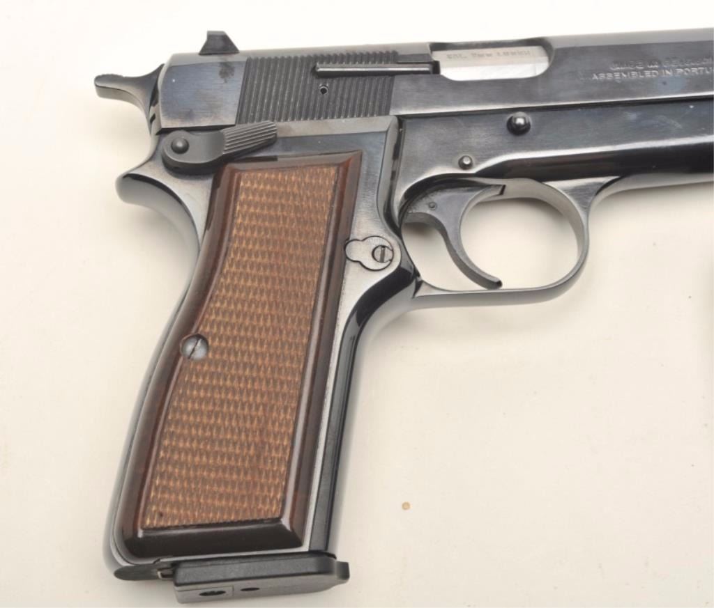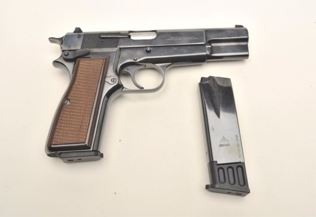 Browning Hi-Power semi-automatic pistol, 9mm caliber, serial #511MY53126. The pistol is in excellent overall condition showing little use. The pistol has a 4 ½” barrel with white outline fixed sights. The pistol retainsnearly all of its high polish blued finish with only light handling wear noted. Marked made in Belgium, the pistol was assembled in Portugal. The checkered wood grips are in very good condition with sharp checkering and light storage wear noted. The pistol comes with two, correct, 10 round Meggar magazines. The bore is very good, the action crisp and markings are sharp on this most desirable Hi-Power. Est.:$600-$1,200. (Modern).