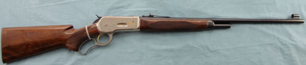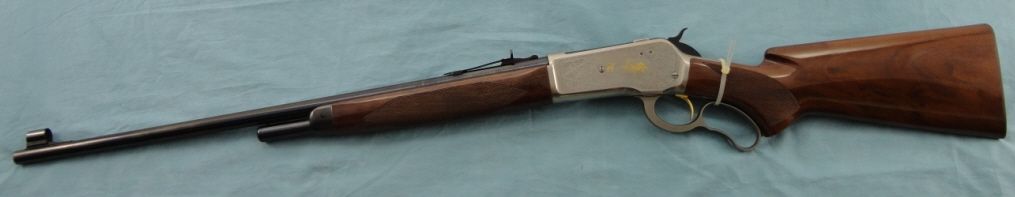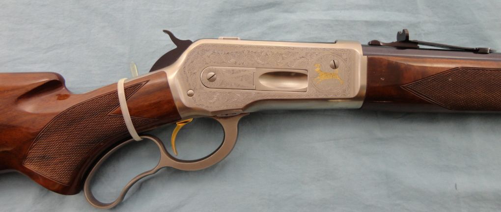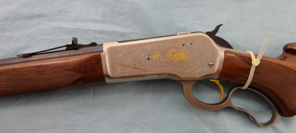 #02505PR6R7; 348 cal. 24" blued bbl. Silver finished engraved receiver w/gold filled game scene & gold trigger. High grade checkered walnut stock. Metal finish is very good w/some very small scratches in bbl. Stock shows small scratches & dents from handling. No box.