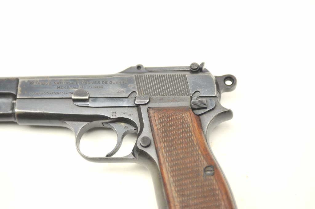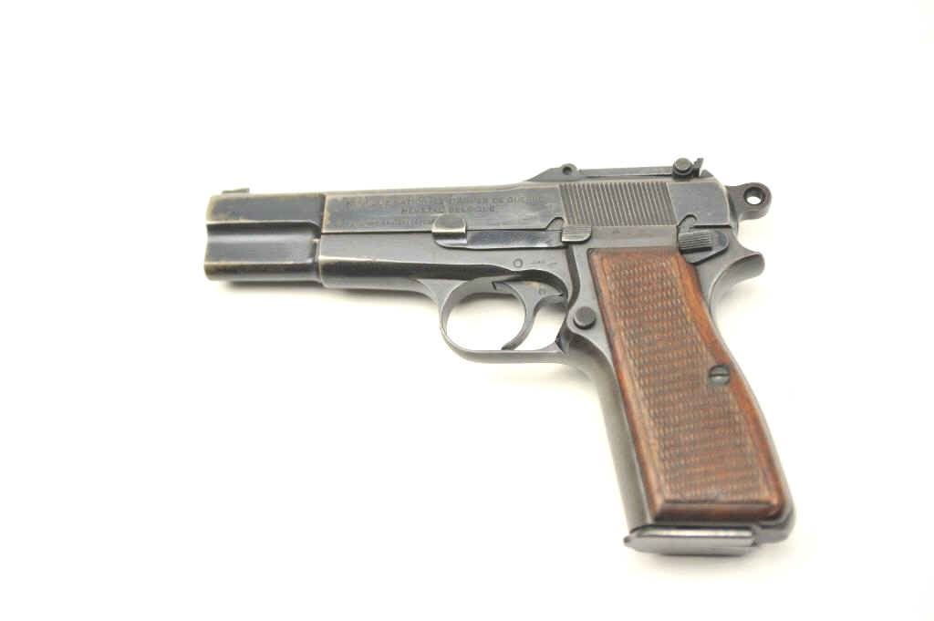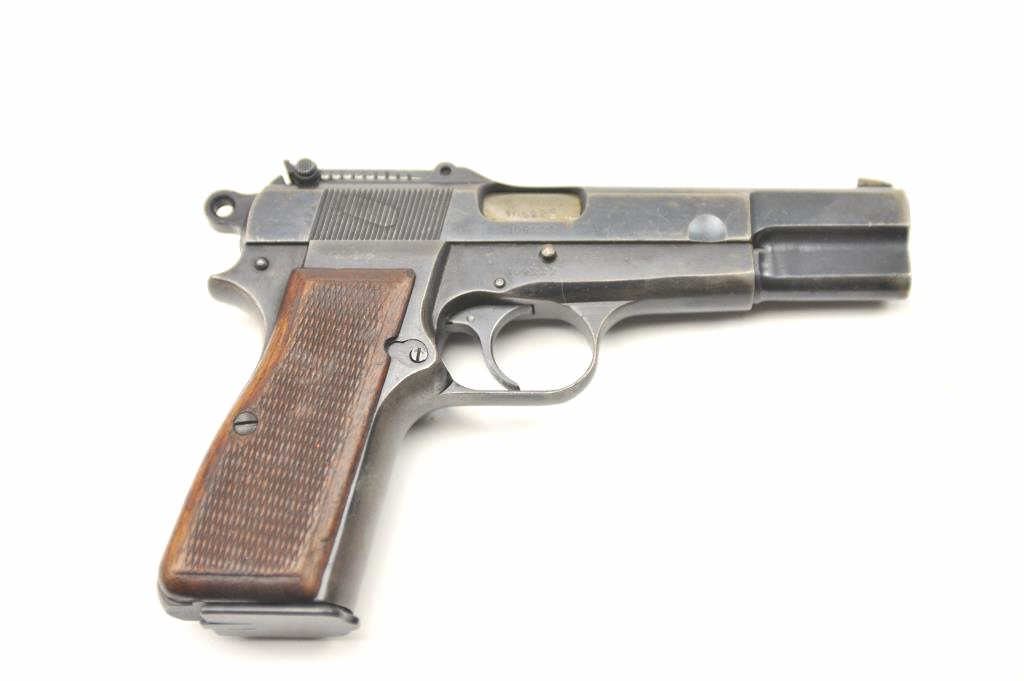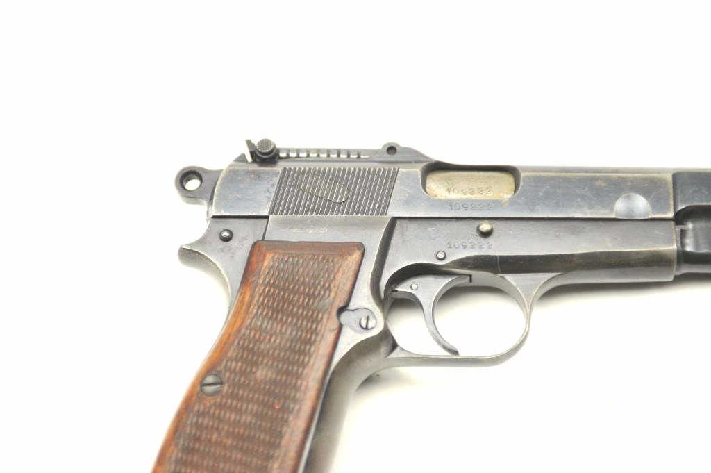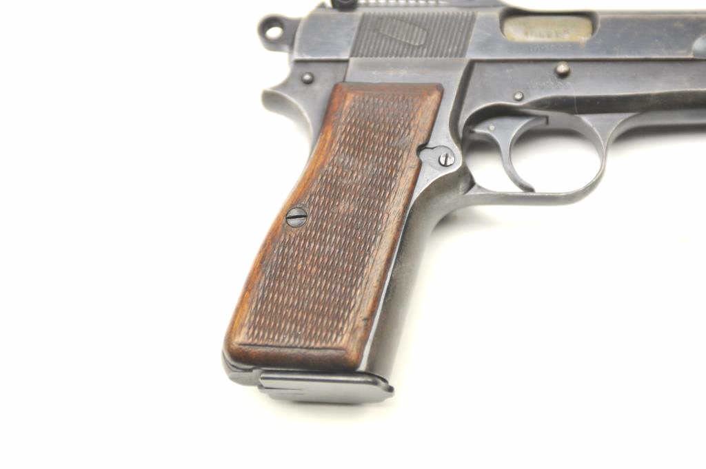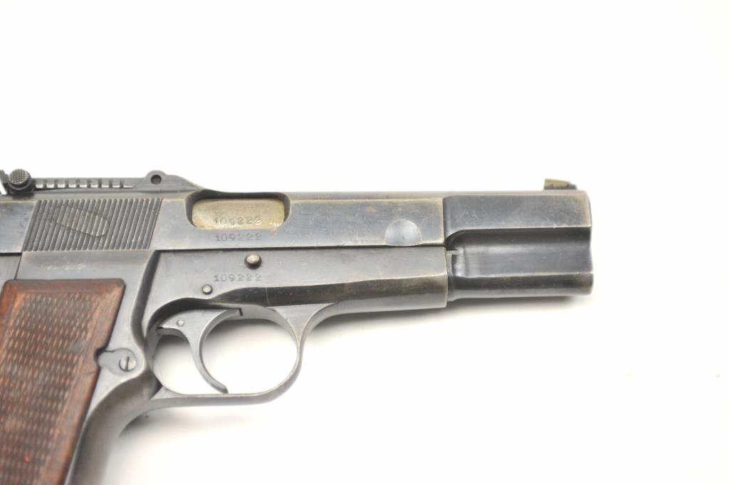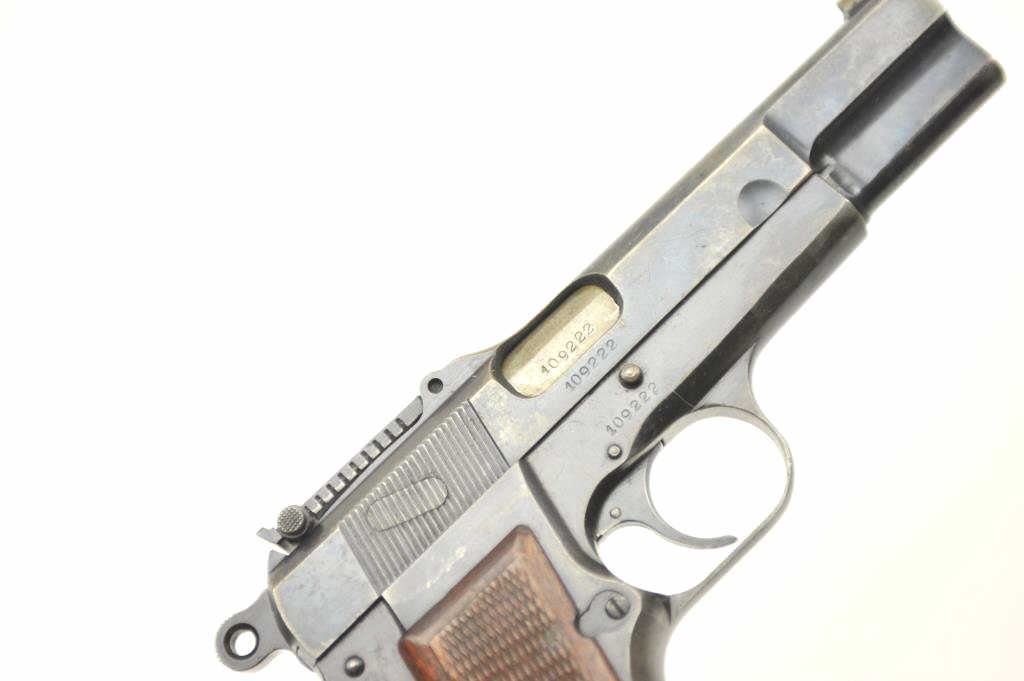 Browning High Power with tangent sight showing Nazi proofs, S/N 109222 in 9mm parabellum. 50%-70% thinning and toning original military blue finish. Good checkered wood grips with some bumps and wear. Goodmarkings. The interior is good and mechanically sound and tight. Blued 14 round not transferable in CA unless blocked. (C&R/PPT) Est.: $800-$1600