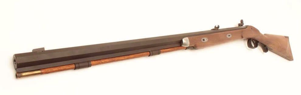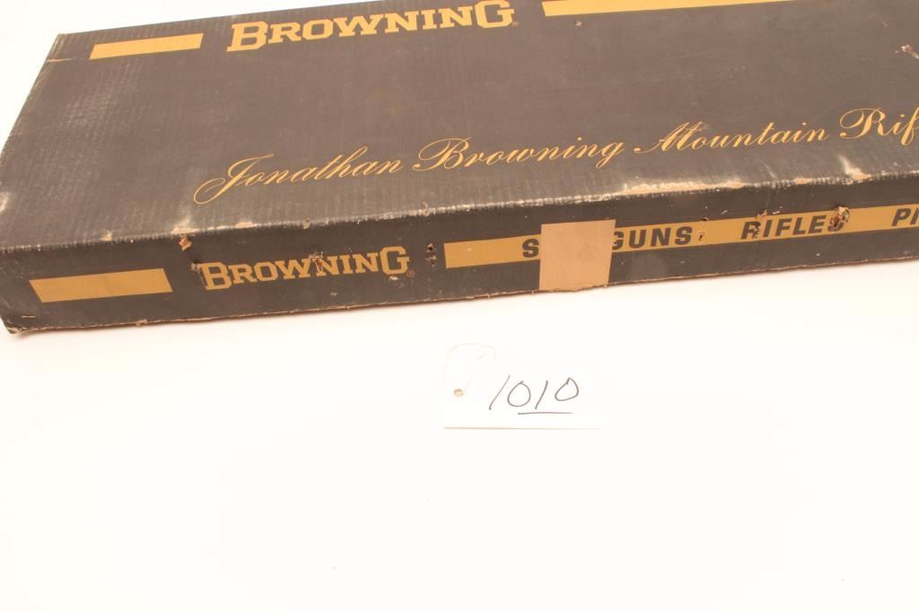 Browning Jonathan Browning Model reproduction percussion mountain rifle, .50 caliber, Serial #857PM02319. The rifle is in as new in the box condition with a 30” browned steel octagon barrel with a knife blade frontsight. The smooth wood stock is in excellent condition with only light storage marks. The rifle is packed in the factory box marked select wood. The box contains all assorted packaging material, operation manual andassociated paperwork. A new in the box Browning Mountain rifle originally purchased in 1984 according to the invoice in the box. Est.: $250-$500.