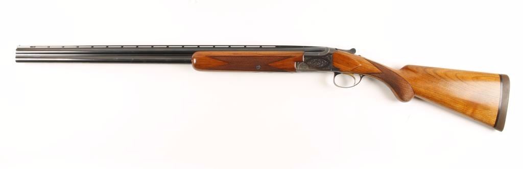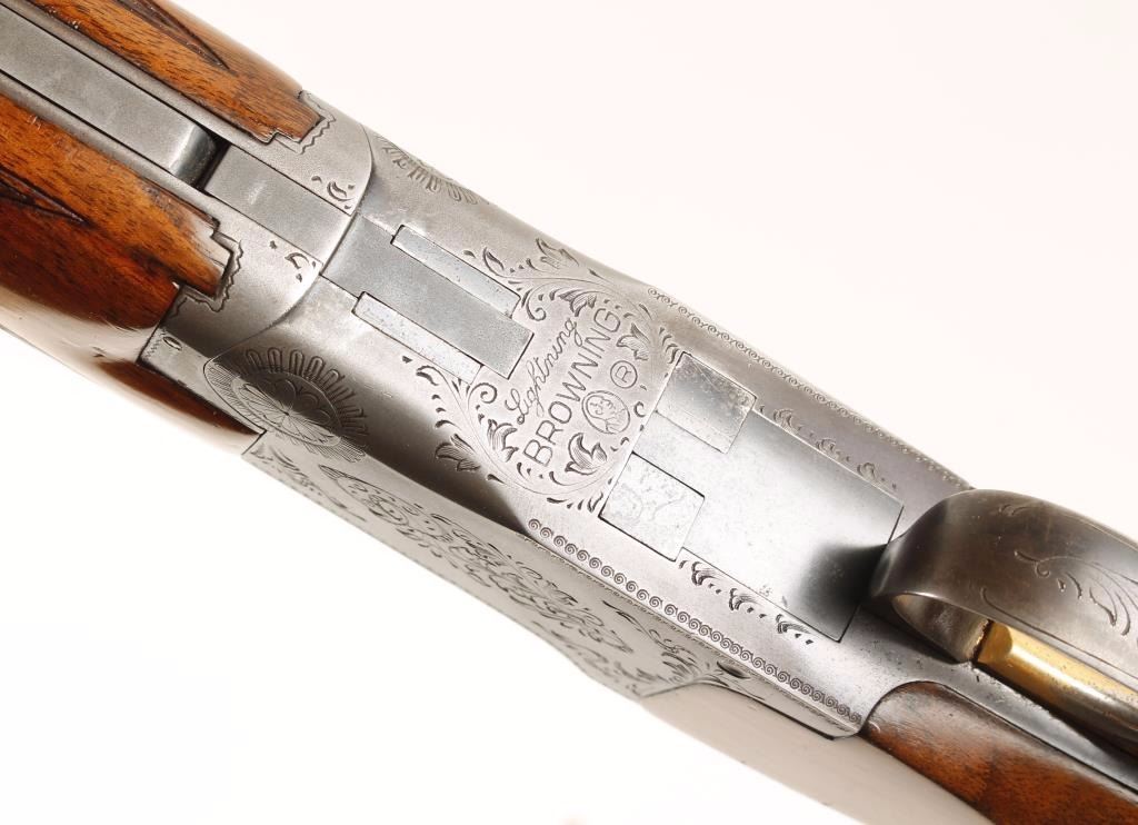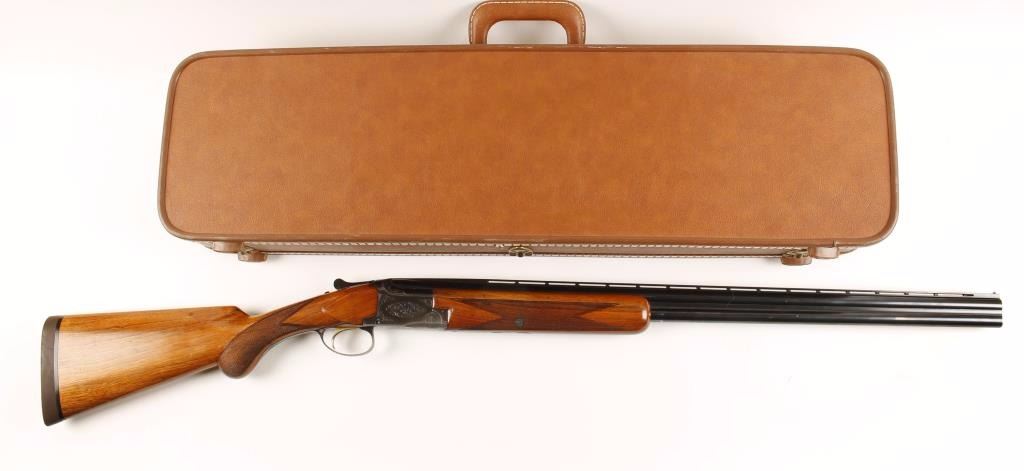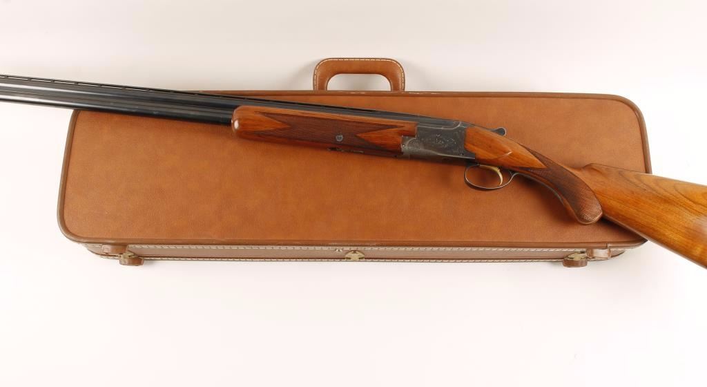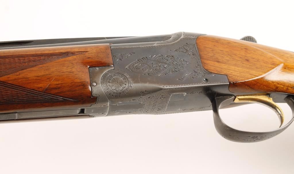 Refinished early Belgium made engraved over and under double barrel shotgun chambered for 2 3/4" & 3" 20 gauge shells. Features refinished 28" blued barrels with raised ventilation rib, brass bead front sight, scroll engraved reblued receiver, checkered top lever, safety/barrel selector switch, single gold trigger and checkered walnut forend and pistol grip shoulder stock with Old English recoil pad. Includes a fitted Browning hard shotgun carrying case. Barrels retain 92% refinished blue with muzzle wear & dings in metal and show evidence of being dropped slightly on crown. Chokes are full and modified from top to bottom. Receiver shows 70% reblue with edge wear and wear from carrying. Wood stocks are near excellent with semi-sharp checkering. Action performs well and bores are pristine. Condition is very good++ ***Modern Firearm***