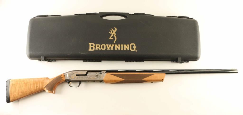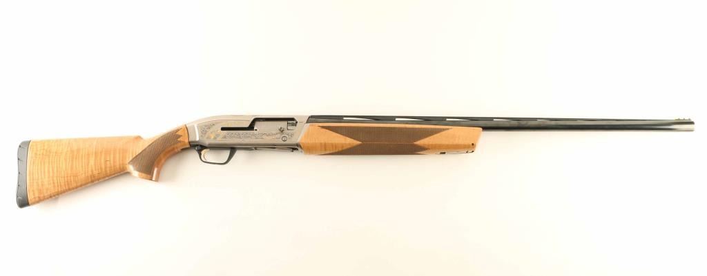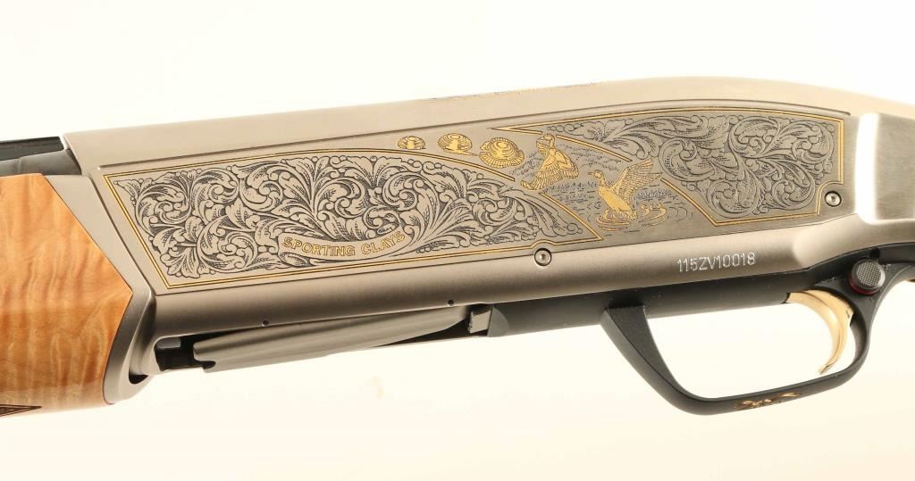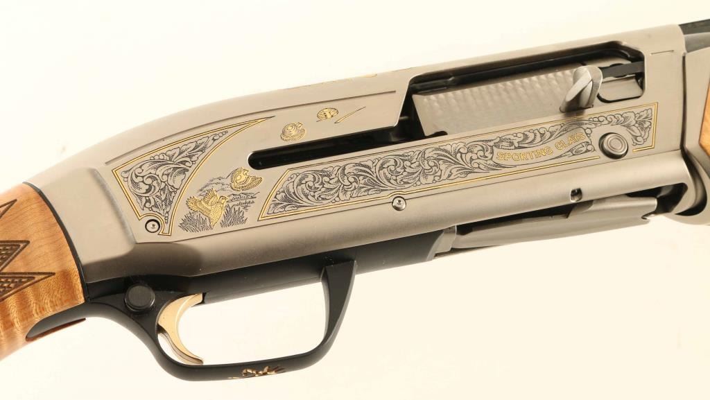 'Sporting Clays' Semiautomatic shotgun made in Portugal for Browning Arms Company, Morgan UT. Accepts 2-3/4" & 3" shells. Features 30" vent rib barrel with installed MOD choke tube, fiber optic front sight, white mid bead, manual safety, rubber recoil pad, blued finish with engraved nickel finish receiver, gold accent trigger, fancy quilted maple wood stock & forend, checkered panels at wrist & forend. Engraved scenes on receiver sides depict birds (ducks on left, pheasant on right) taking flight changing gradually into clay birds, "SPORTING CLAYS" banners, floral scrolls. Engraving is bordered with gold lines and feature gold color fill of birds. Overall condition is like new with few signs of use. Approx stock measurements: 14" Length of Pull, 1-5/8" Drop at Comb, 2-1/4" Drop at Heel. Includes factory case, manual, choke wrench, extra choke tubes (SKT, IMP CYL, IMP MOD, FULL), stock spacers, replacement fiber optic inserts, . Condition is NRA Excellent - like new *** Modern Firearm ***