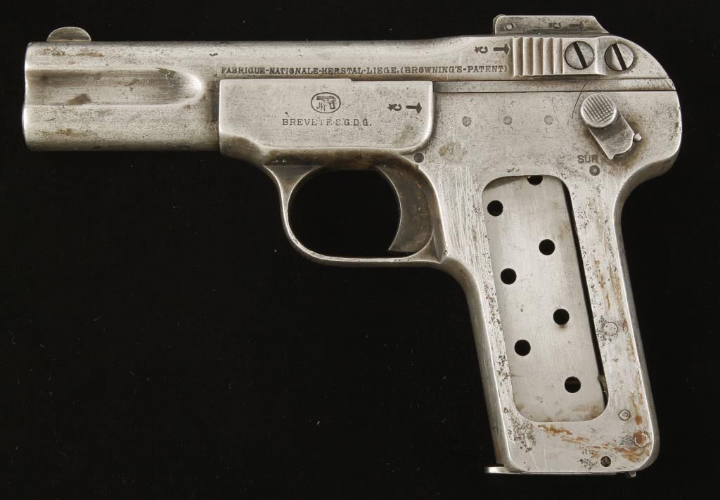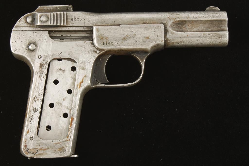 Single action semi auto pistol made in Belgium with 4" barrel. Has been stripped of all the finish and is missing the grips. Bore is fair and action functions properly. *Curio & Relic Firearm*