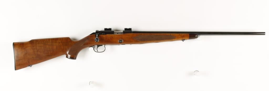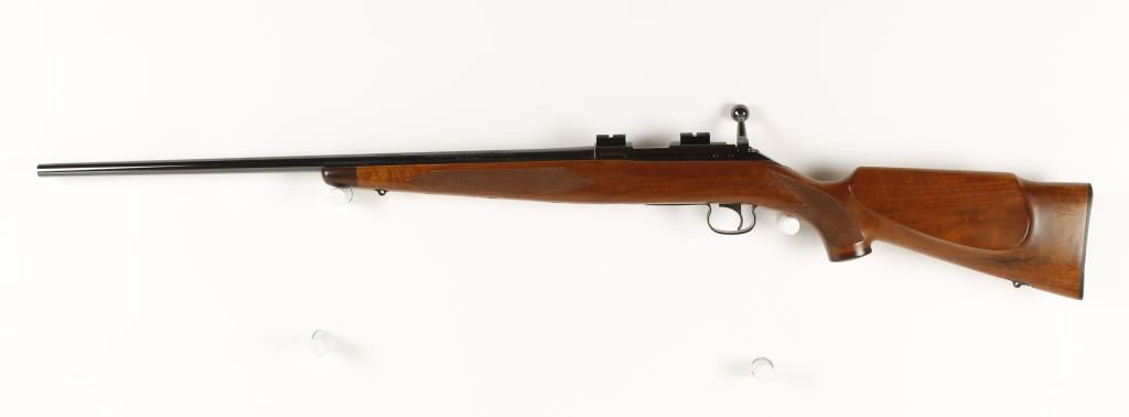 Limited edition bolt action rimfire sporter rifle with detachable magazine, based on the original Winchester model 52, with 24" barrel. Blued finish, checkered walnut stock with oil finish, with rosewood forend cap and pistol grip cap. Fitted with scope bases, drilled and tapped for side mount peep sight. Very good bore and action, includes 1 magazine. Condition: Very good to excellent showing little use. *MODERN FIREARM*