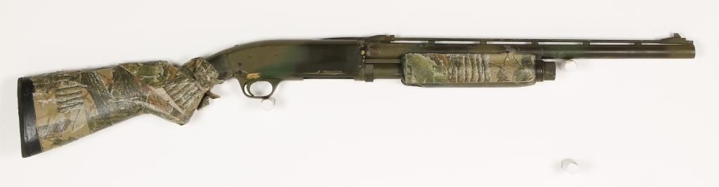 Pump action bottom eject shotgun with 20" vent rib barrel. Has been heavily painted in traditional camouflage pattern, with buttstock wrapped in camouflage tape. Very few markings exist due to paint. Good bore and action. Condition: Fair as personalized. *Modern Firearm*