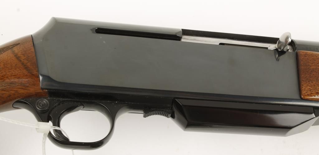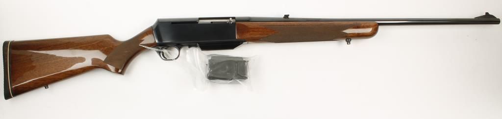 Belgium made semi auto sporting rifle with 24" barrel. Blued finish, checkered pistol grip walnut stock and forearm, detachable box magazine, folding rear leaf sight and black rubber butt pad. Drilled and tapped for scope mounts. Very good bore and action. Includes 3 magazines. Condition: Excellent