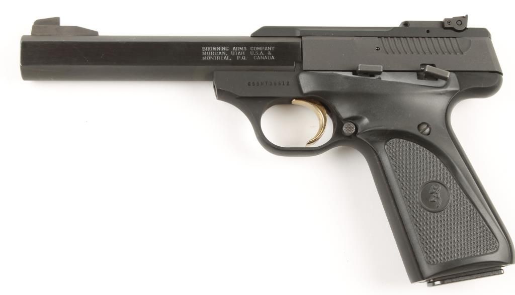 Single action semi auto rimfire pistol with 5-1/2" bull barrel. Matte blue finish, checkered black rubber grips with thumb rest and adjustable rear sight. Excellent bore and action. Includes 1 magazine. Condition: Excellent.
