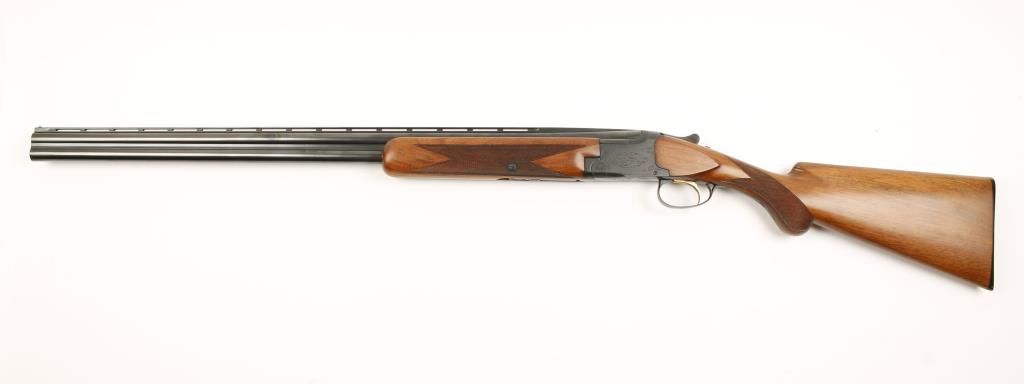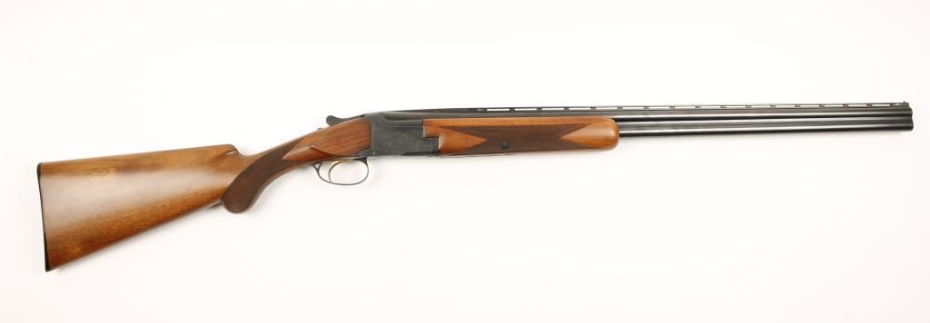 Beautiful Belgium made over under lightweight grade I shotgun with 28" vent rib barrels. Blued finish, checkered round knob pistol grip walnut stock and forend, single select trigger, tang safety and plastic butt plate. Top barrel is full choke and bottom barrel is modified. Very good bores and action. Condition: Excellent *Modern Firearm*