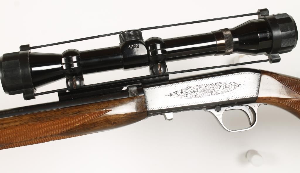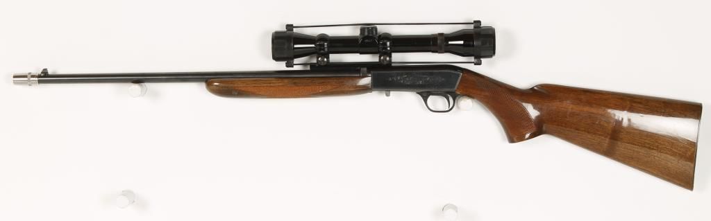 semi auto takedown rimfire rifle made in Japan with 19-1/4" threaded barrel. Blued finish, scroll engraved receiver, checkered pistol grip walnut stock and forearm, rear sight has been removed and fitted with Tasco 4X32 scope. Good bore and action. Condition: Very good showing light use and one small ding in forend. *Modern Firearm*
