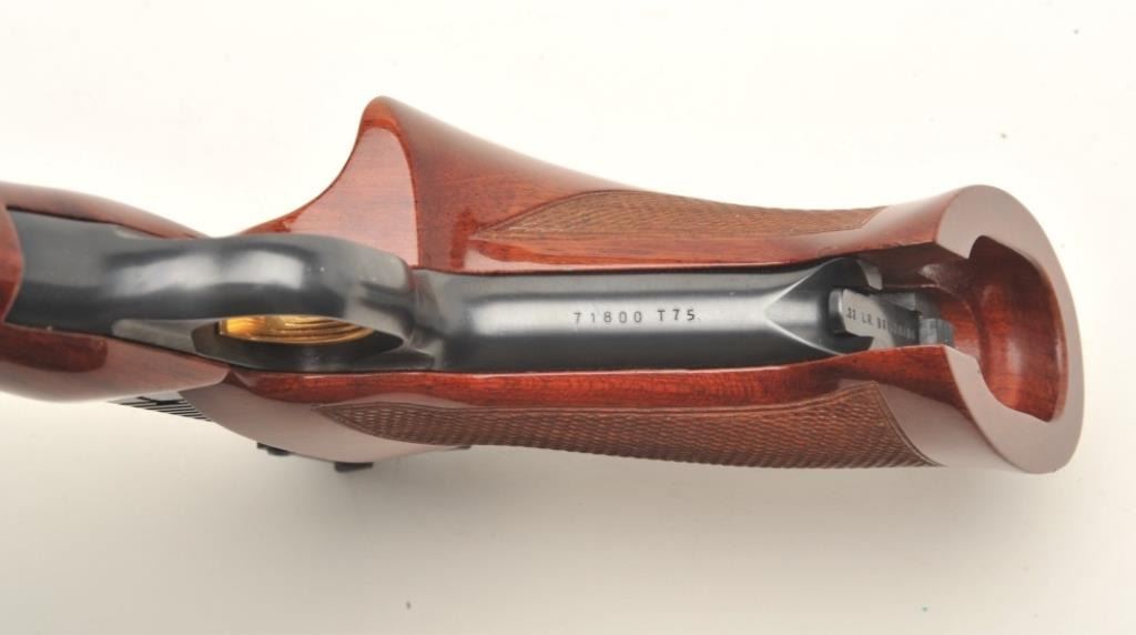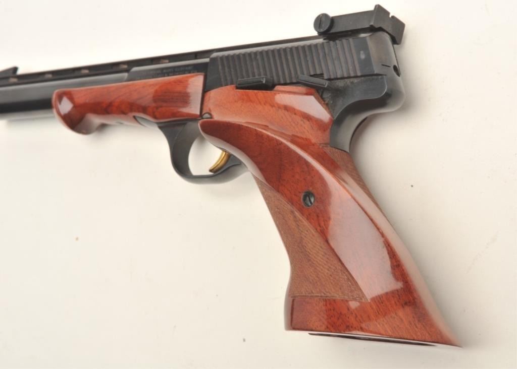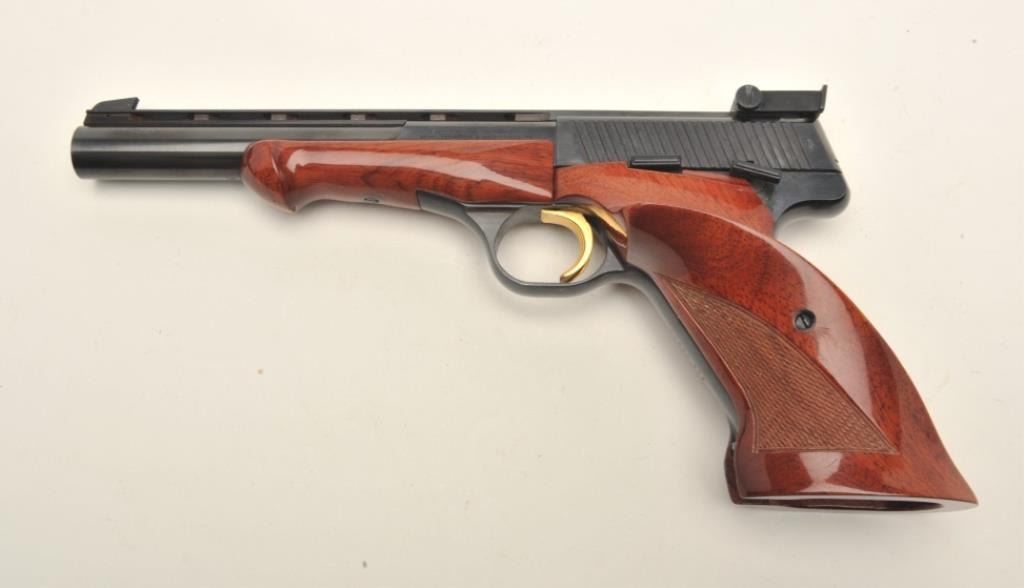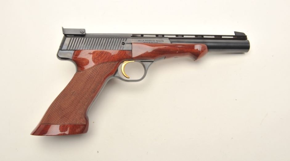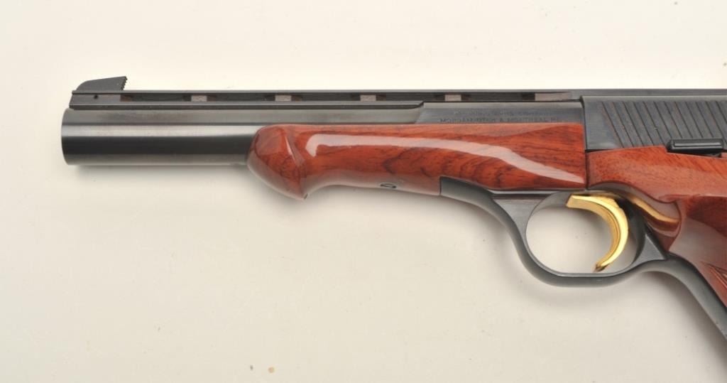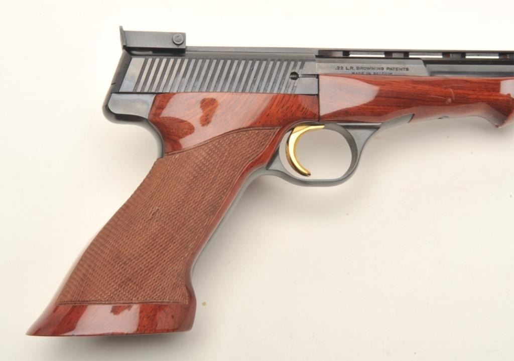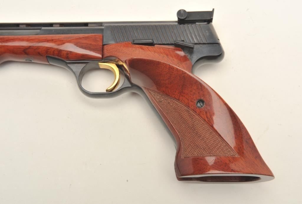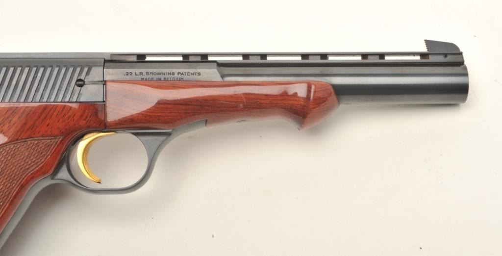 Browning Medalist semi-automatic target pistol, .22LR caliber, 6.75” ventilated rib barrel, blued finish, gold trigger, checkered thumb rest target grips and wood forend, S/N 71800 T75, in overall fine condition showing approximately 99% original blue finish, fine bore, action, markings and grips. (Modern/PPT). Est.: $600-$1,200.