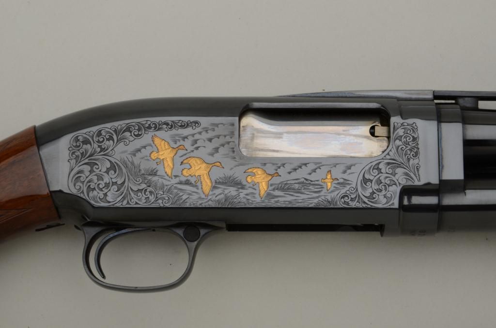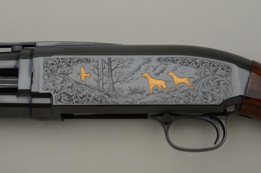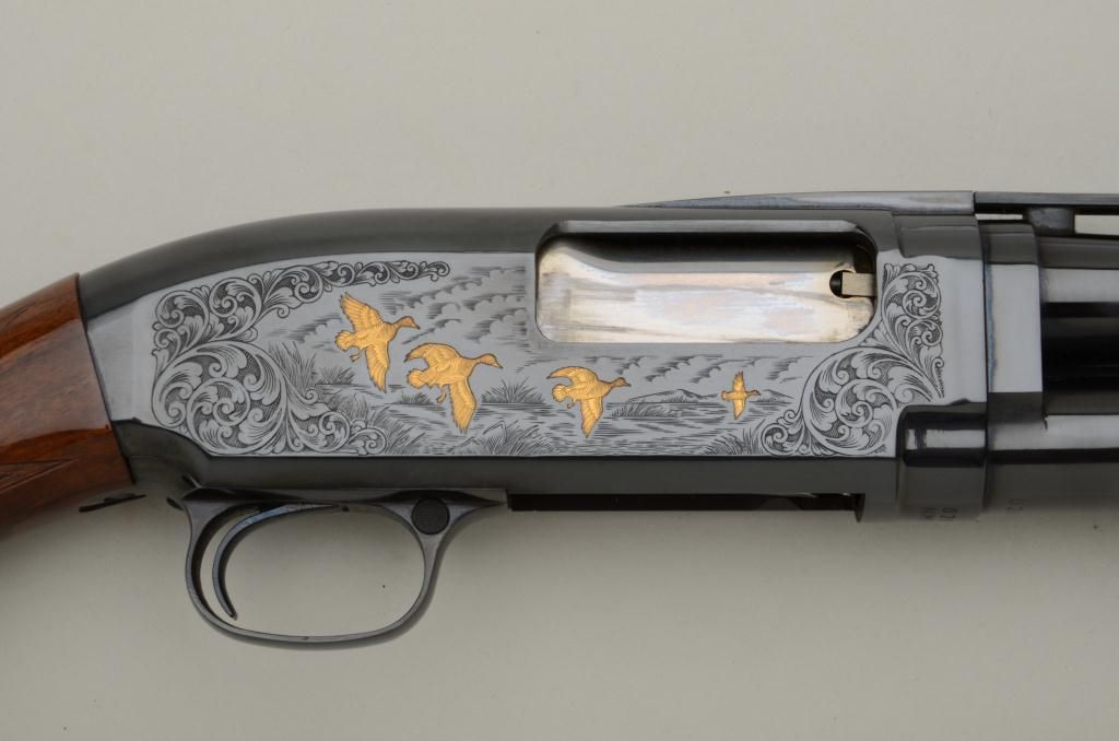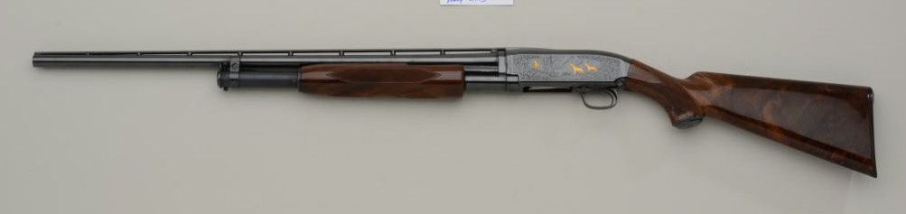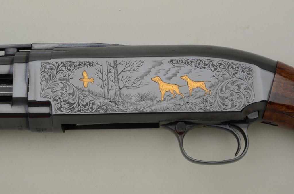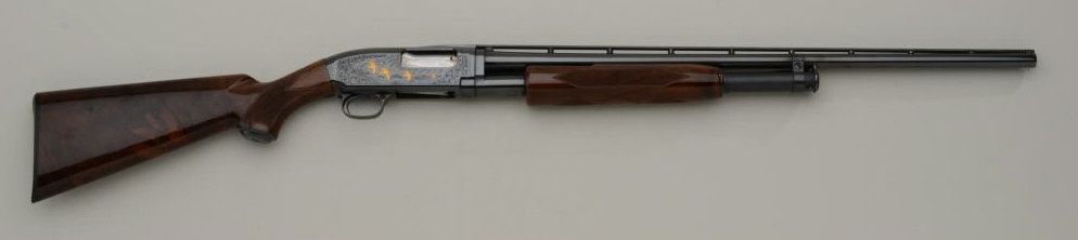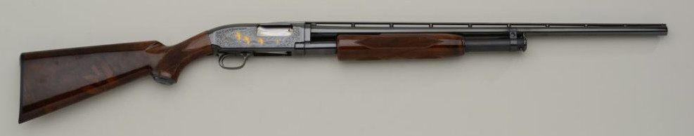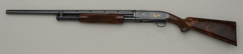 Browning Model 12 pump action takedown shotgun, .28 gauge, 2-3/4” shells, modified choke, 26” ventilated rib barrel, blue finish, engraved receiver with gold ornamented game scenes on both sides, deluxecheckered wood stocks, #02802NM972. This gun is in overall fine to excellent condition showing approx. 99% finish with a fine bore, crisp action, sharp markings and fine wood with particularly beautiful graining to buttstock. Est.: $750-$1,500.