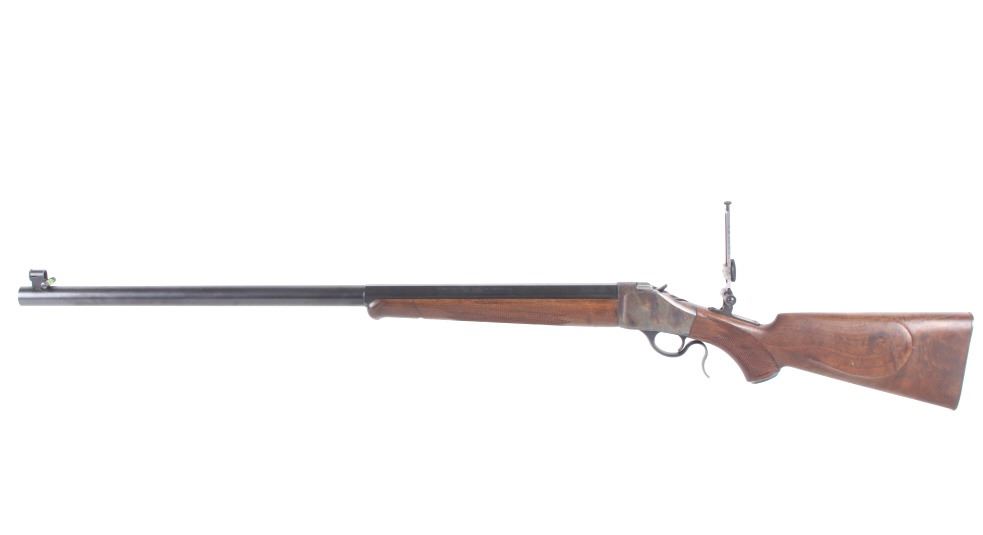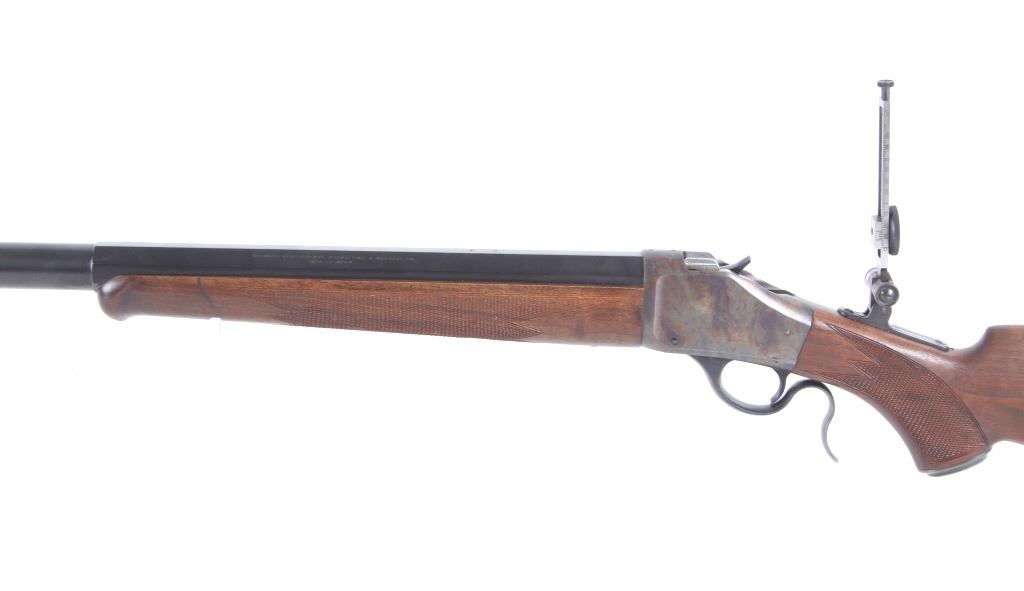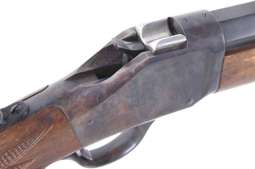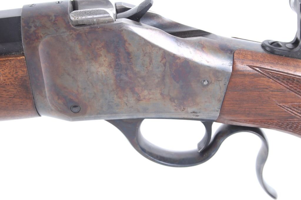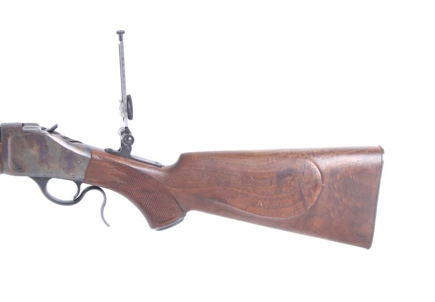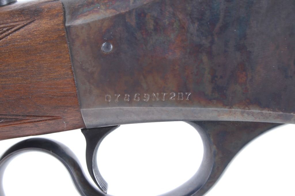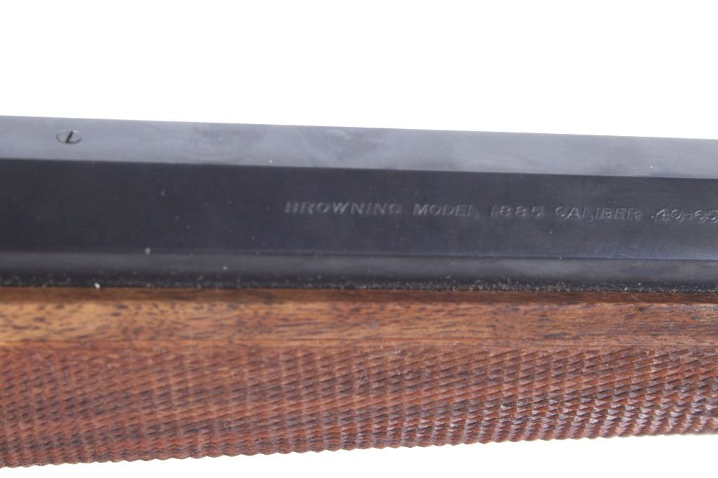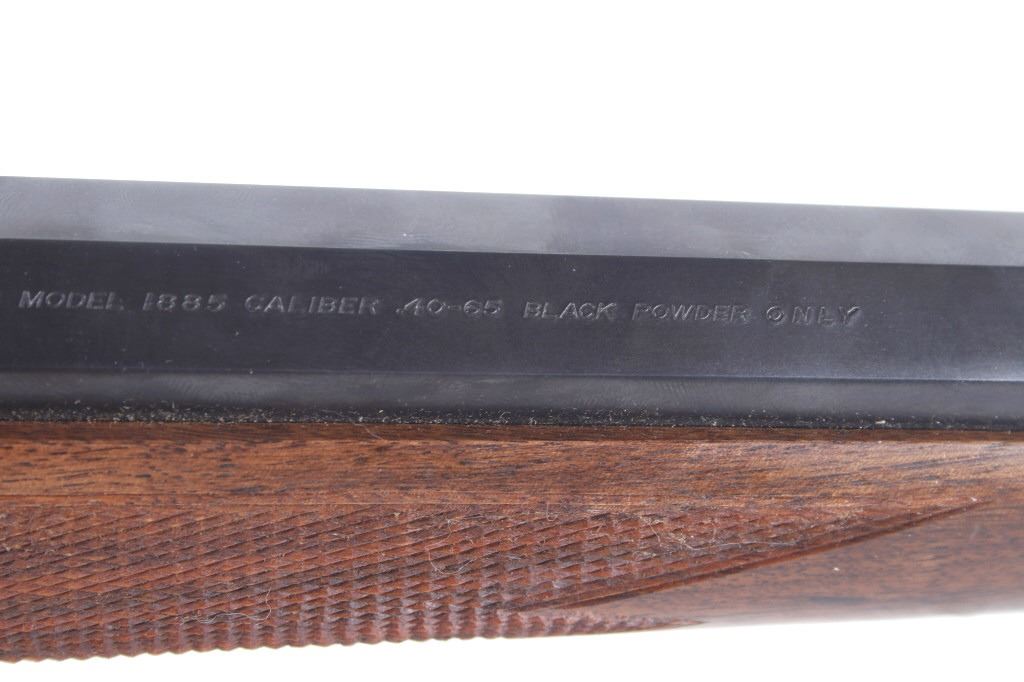 Featured in this lot we have a Browning Model 1885 falling block rifle chambered in .40-65 caliber black powder. The rifle displays 29" long octagonal barrel with a rounded end, and walnut stock. The rifle displays an adjustable folding rear sight with a hooded fixed front sight with a level. The barrel is marked across the left side reading "Browning Arms Company Morgan, Utah & Montreal P.Q. Made in Japan" with the right side of the barrel marked "Browning Model 1885 Caliber .40-65 Black Powder Only". The rifle shows good condition overall with some light wear due to travel and use. The rifle shows a clean bore and tight action. Serial Number: 07869NT2B7. This is a modern firearm and requires a FFL transfer or NICS background check.
