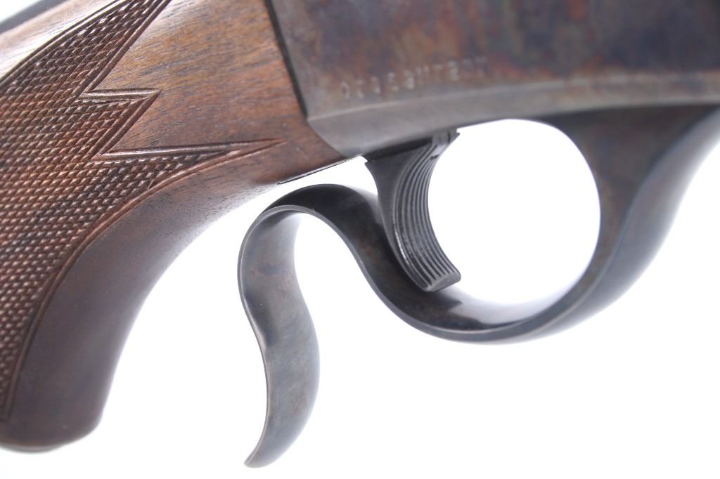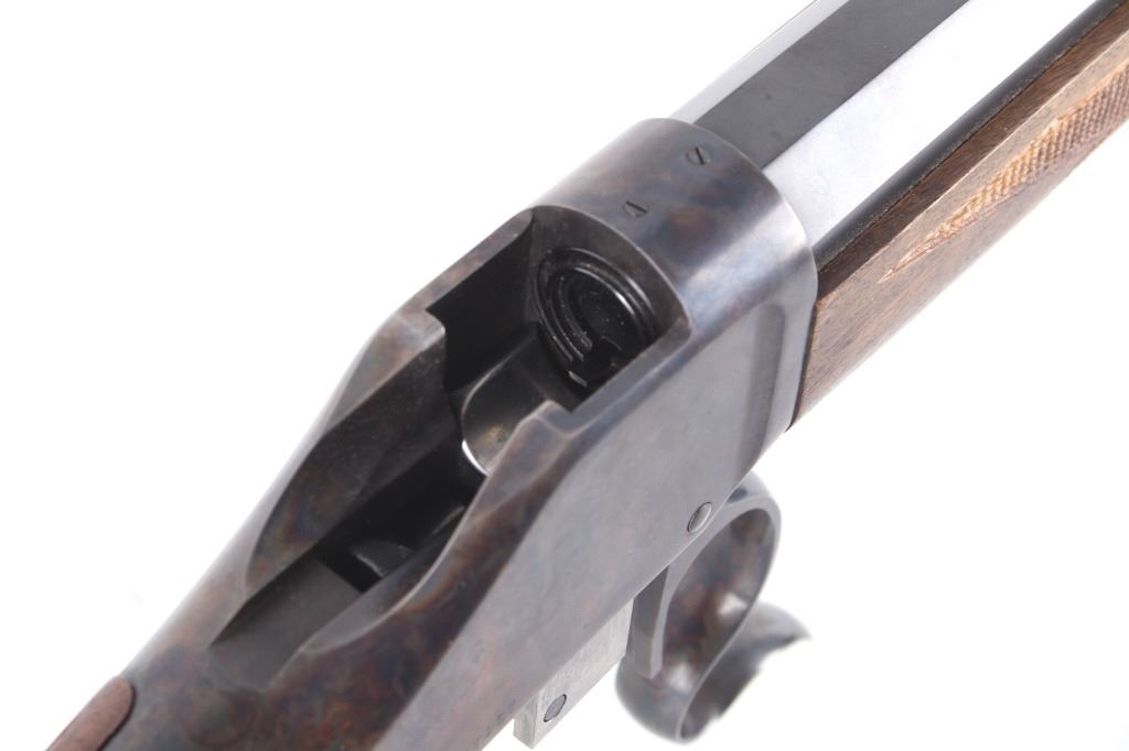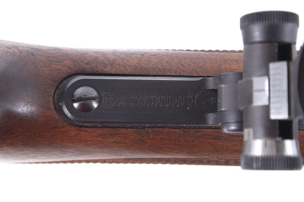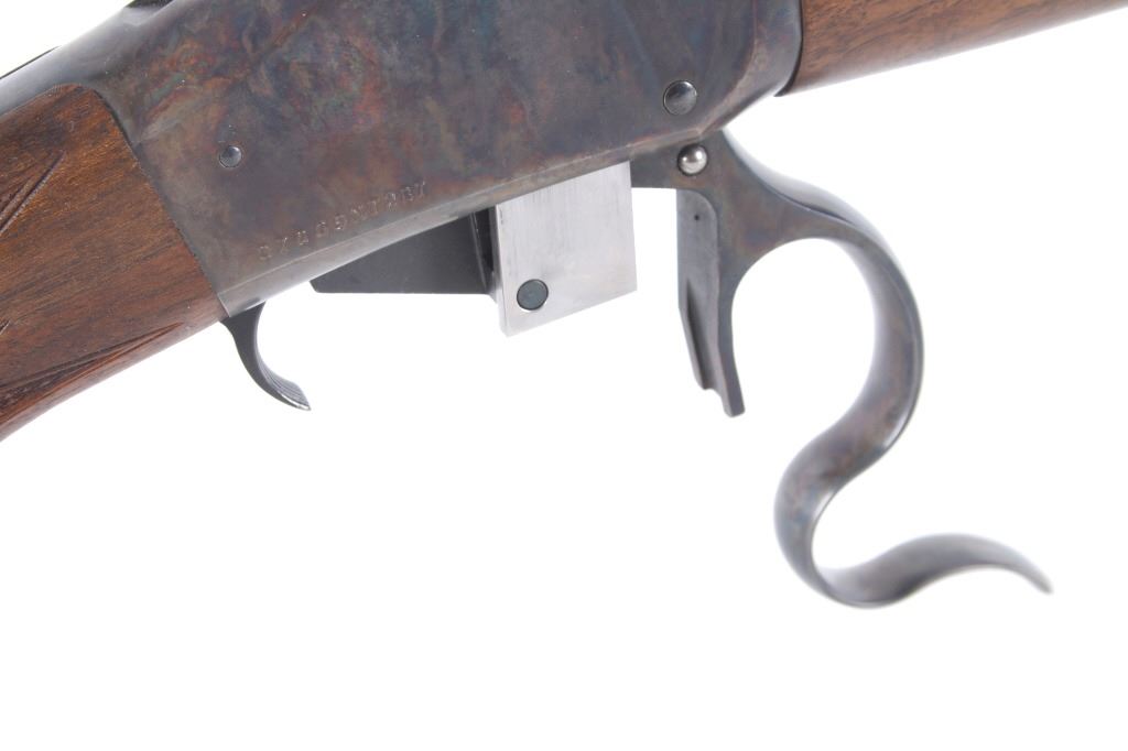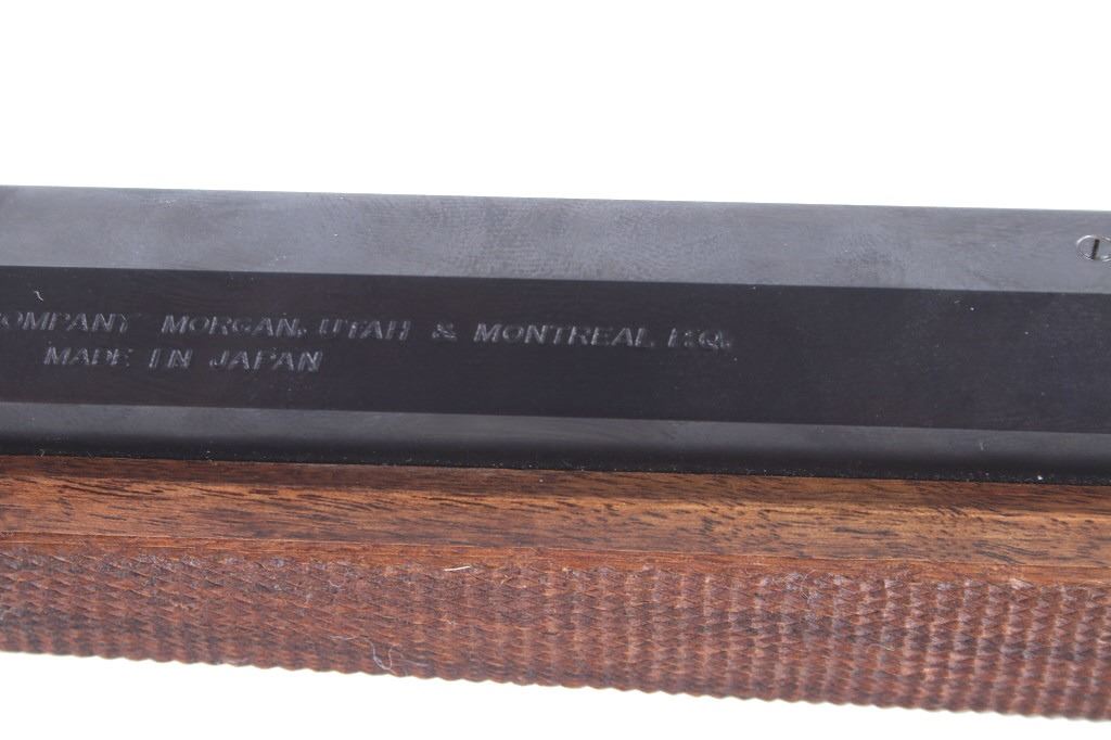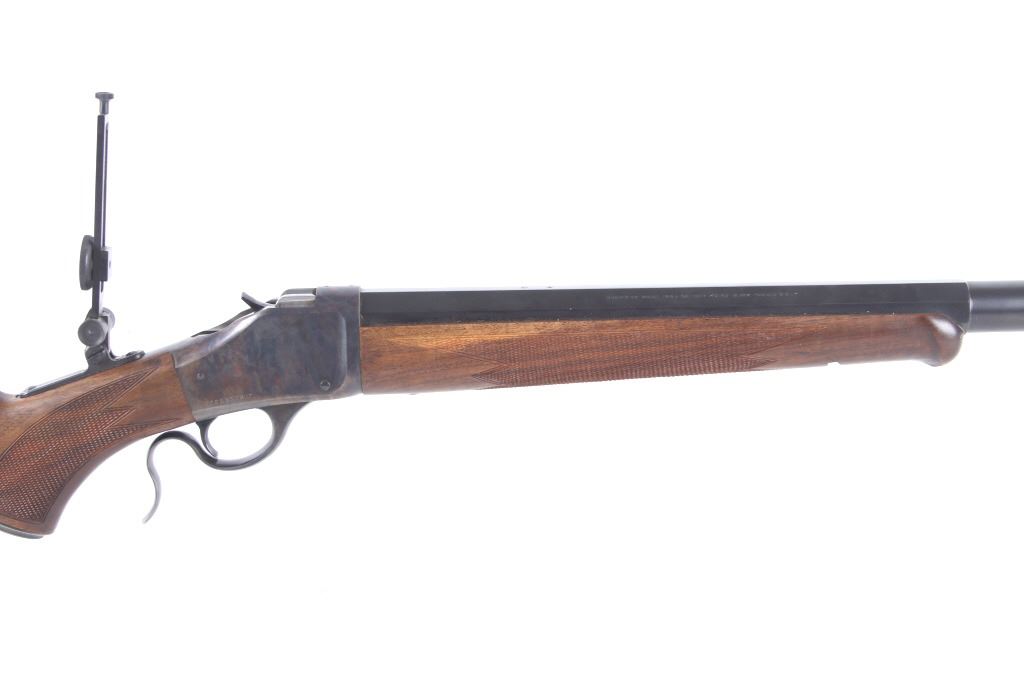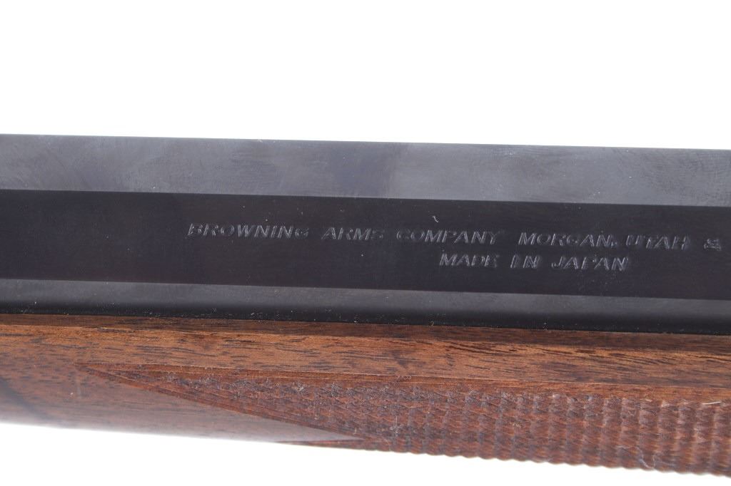 Featured in this lot we have a Browning Model 1885 falling block rifle chambered in .40-65 caliber black powder. The rifle displays 29" long octagonal barrel with a rounded end, and walnut stock. The rifle displays an adjustable folding rear sight with a hooded fixed front sight with a level. The barrel is marked across the left side reading "Browning Arms Company Morgan, Utah & Montreal P.Q. Made in Japan" with the right side of the barrel marked "Browning Model 1885 Caliber .40-65 Black Powder Only". The rifle shows good condition overall with some light wear due to travel and use. The rifle shows a clean bore and tight action. Serial Number: 07869NT2B7. This is a modern firearm and requires a FFL transfer or NICS background check.