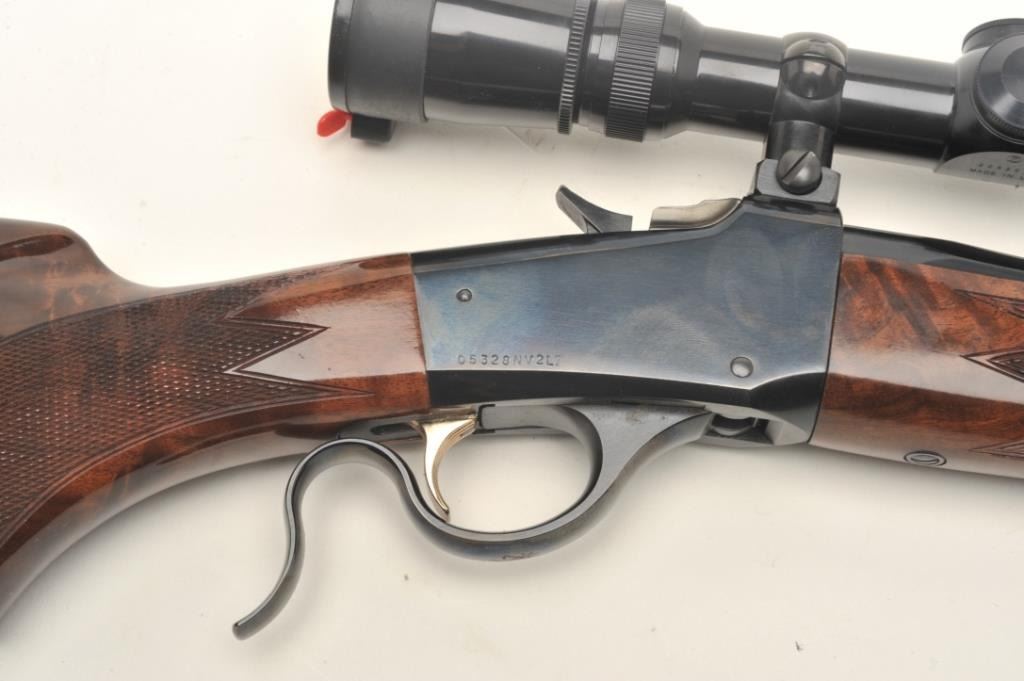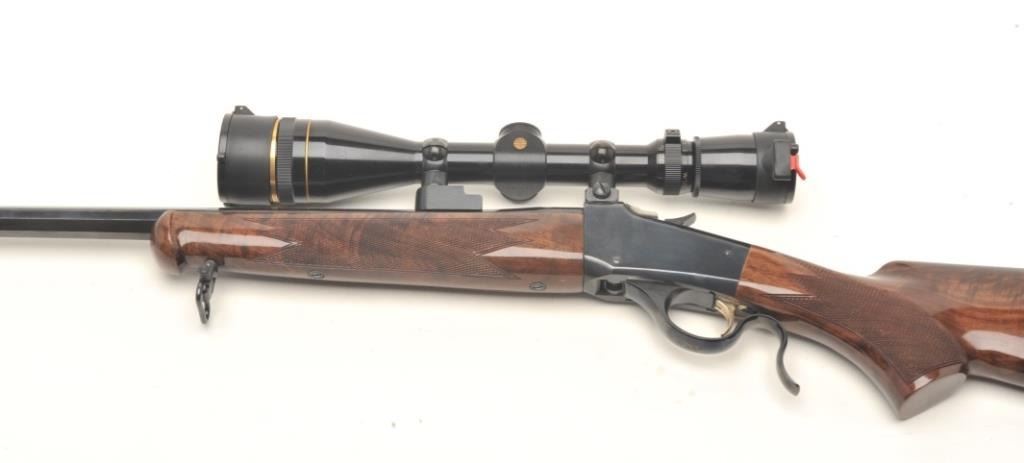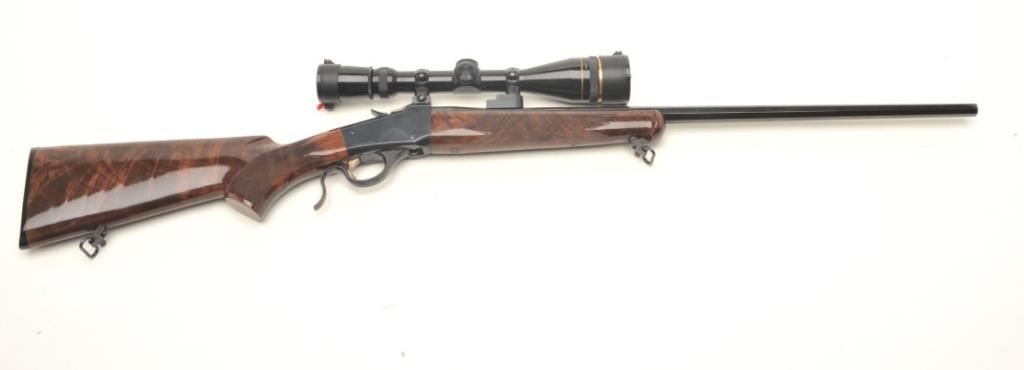 Browning Model 1885 single shot rifle, .223 Rem. caliber, 24” octagon barrel, blued finish, checkered deluxe wood stocks with fine flame graining, S/N 05328NV2L7, mounted with a Leupold Vari-X III 4.5 x 14 scope with sharp optics; gun is in overall like new condition. (Modern). Est.: $600-$1,200.