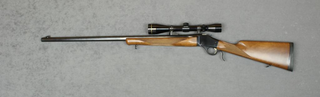 Browning Model 1885 single shot rifle, .45-70 cal., 28” octagon barrel, black finish, checkered wood stocks, #08049PV247. This gun is in overall excellent condition showing approx. 99% original finish, fine bore,action, markings and wood; mounted with a Leupold VX-II 3-9 x 40mm scope with clear optics; sling swivels. Est.: $600-$1,000.
