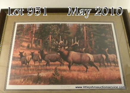 Browning Model 1885 single shot rifle, 45-70 cal., 28” octagon barrel, blue finish with gold 2002 Friends of NRA gun of the Year ornamentation (354 of 875), deluxe checkered wood stocks, sling swivels, #01071MY371. This gun is in overallpristine condition showing little handling; in addition to above-noted gold ornamentation on the right side of the receiver, there is a gold ornamented game scene of elk on the left side of the receiver. The wood stocks have a beautifulflame grain and fine factory finish, in original factory two piece black cardboard box with instructions, gun lock, etc. and the box is numbered to this specific gun; accompanied by a beautifully framed and matted large color Friendsof NRA print of an elk herd in the woods, approx. 30” X 39” entitled “Hesitant Harem” by Gary W. Moss. Est.: $750-$1,500.