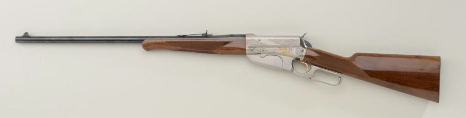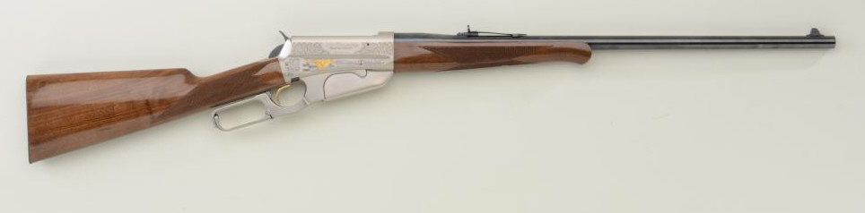 Browning Model 1895 One of One Thousand Commemorative lever action rifle, 30-40 cal., 24” round barrel, black finish to barrel with stainless steel engraved receiver with two gold game scenes (one on each side),checkered wood stocks, #00323PV687. This gun is in like new condition showing little handling; one small ding to the wood on the right side of the fore stock at top rail and a couple minor mars to the butt stock fromstorage. Est.: $500-$1,000.