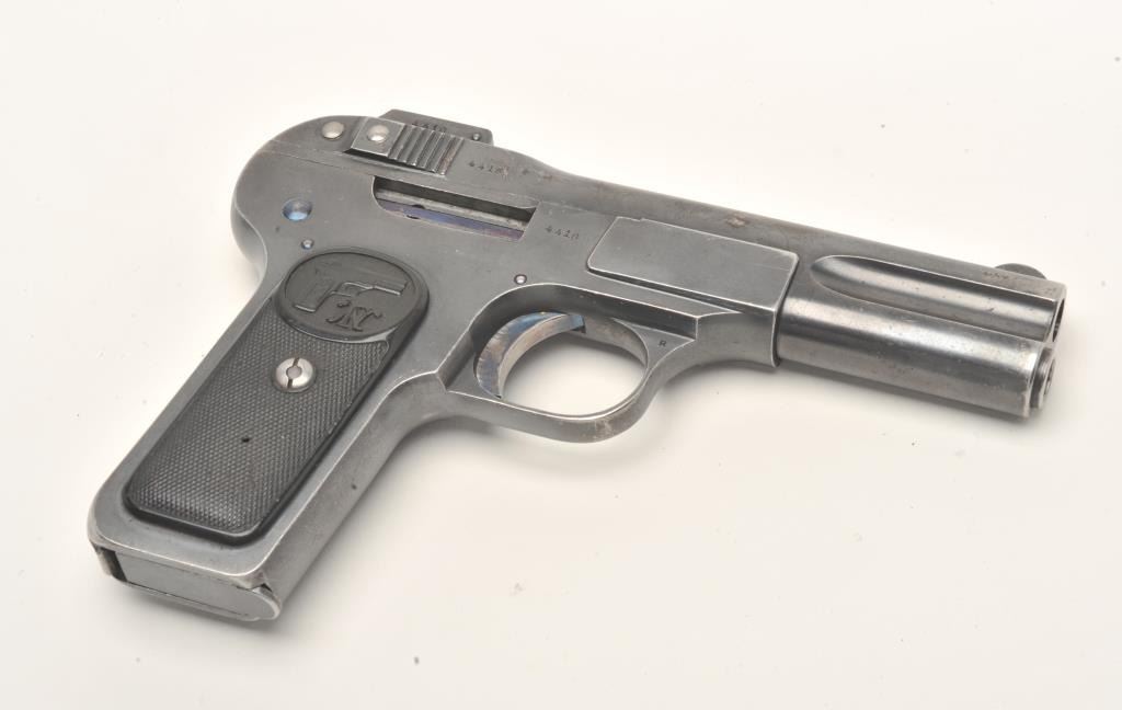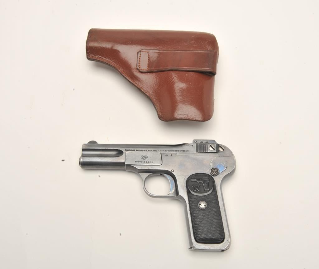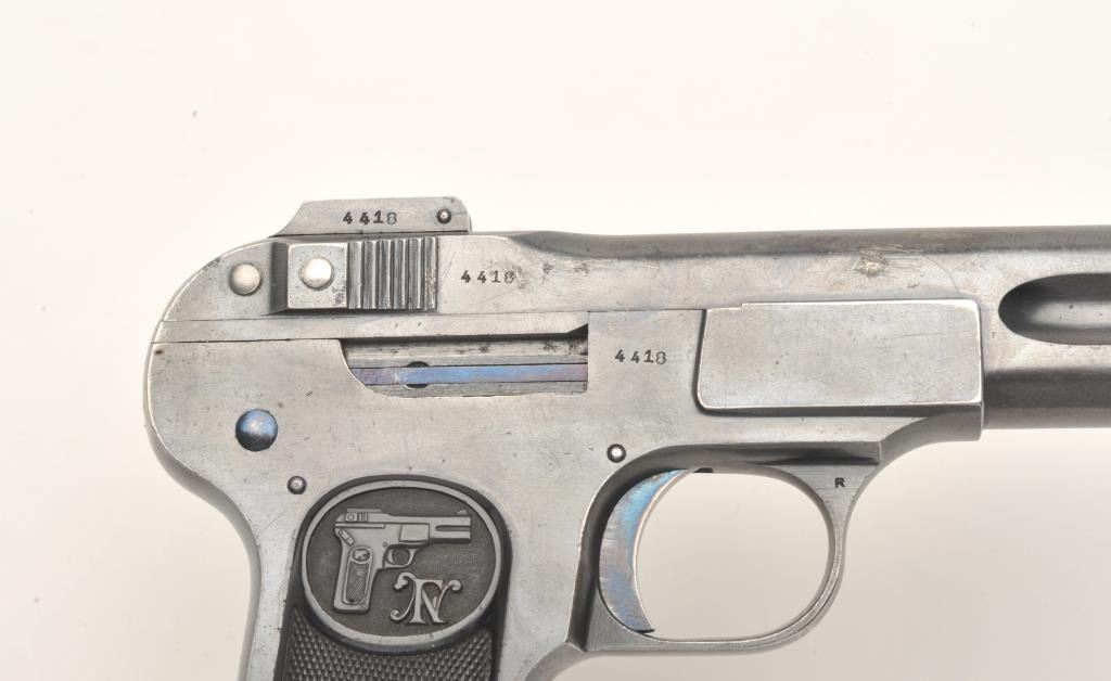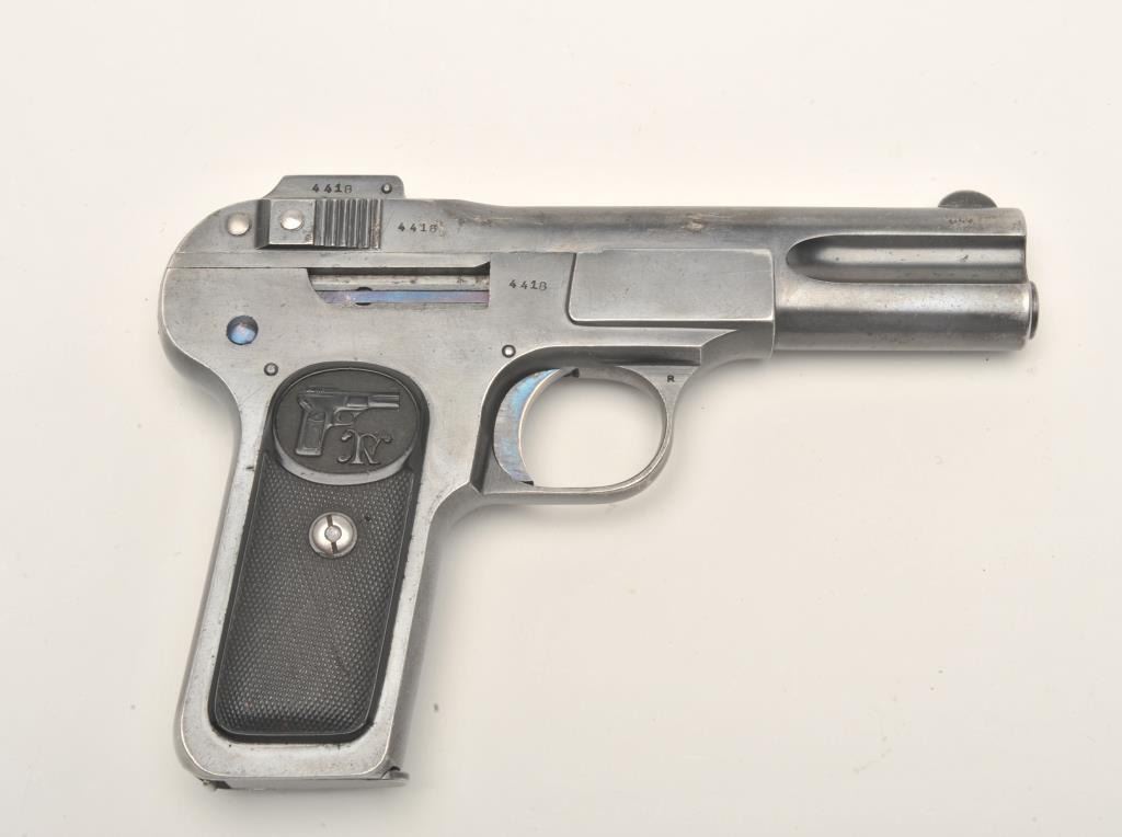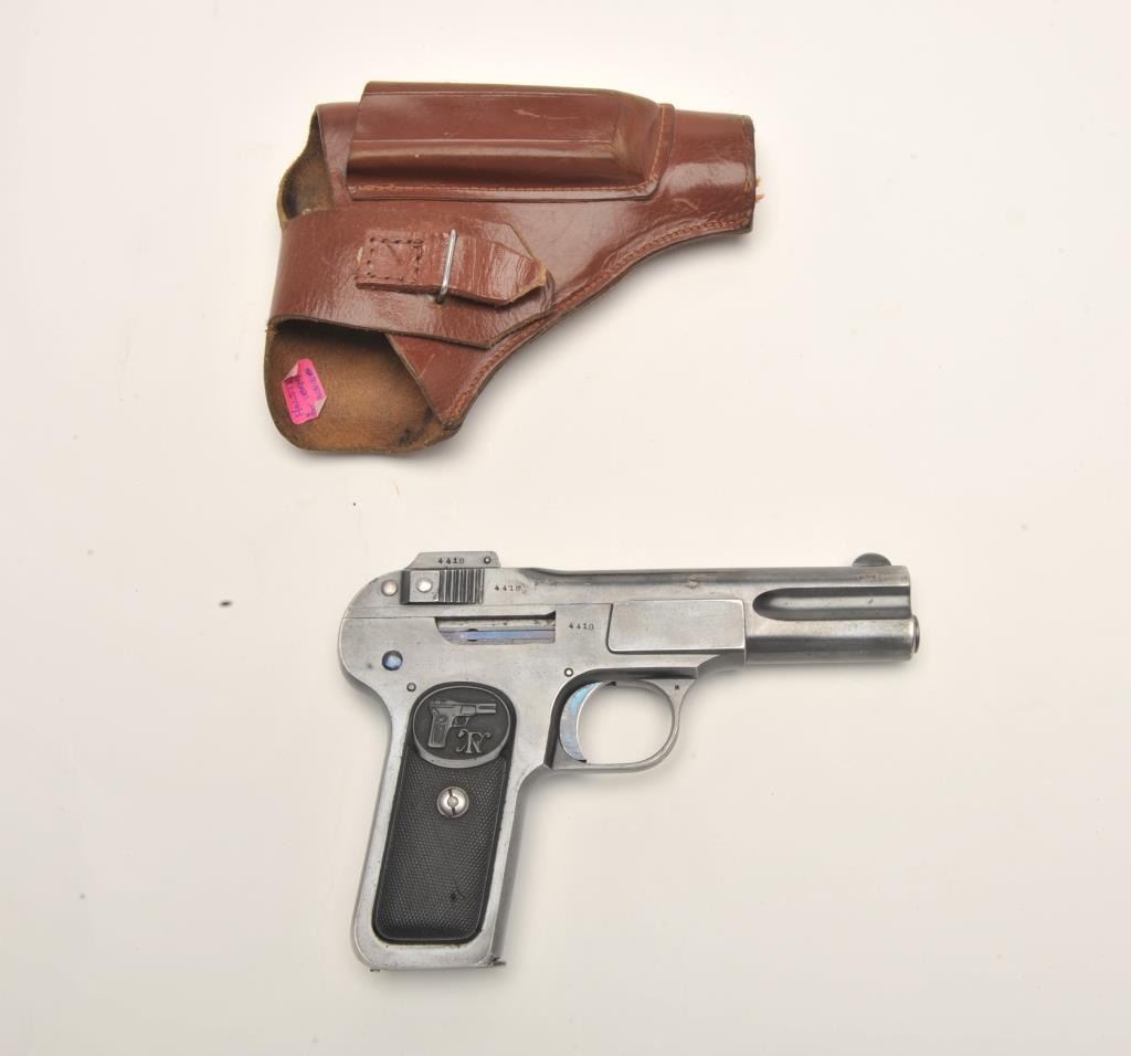 Browning Model 1899 semi-automatic pistol, .32 ACP caliber, 4” barrel, blued finish, scarce early checkered hard rubber grips, S/N 4418, with brown leather flap holster. The gun is in overall very good to near finecondition displaying the majority of its original blue finish, fine bore, crisp action, sharp markings and very good + grips. (C&R/No PPT). Est.: $500-$1,000.
