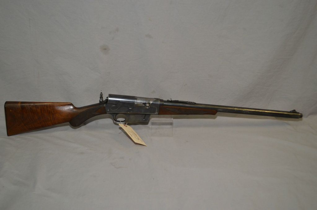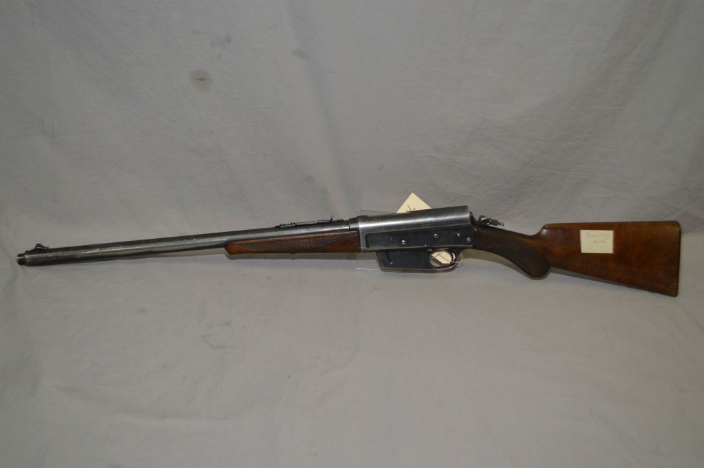Browning Model 1900 Deluxe 35 Remington Only cal. semi-automatic rifle with 22" barrel [ Manufactured by F.N from 1910-1931, only 9913 made in standard and deluxe grades, similar to the Remington model 8 auto loading rifle, this is the deluxe model with rounded checkered walnut stock, has blued finish starting to fade in some areas, barrel sights, including a folding tang sight, missing slings swivels and studs] Serial: 2295