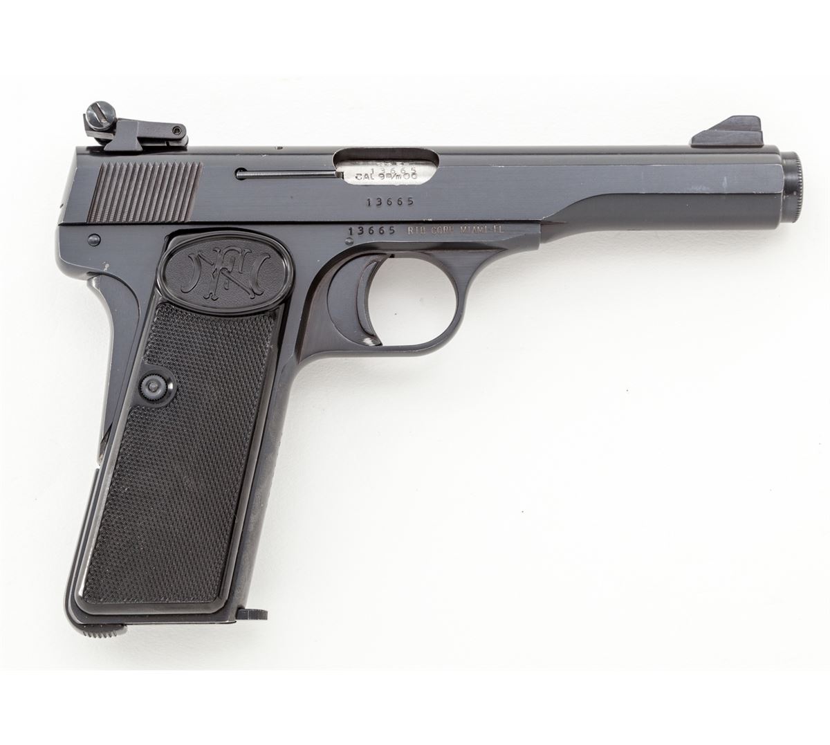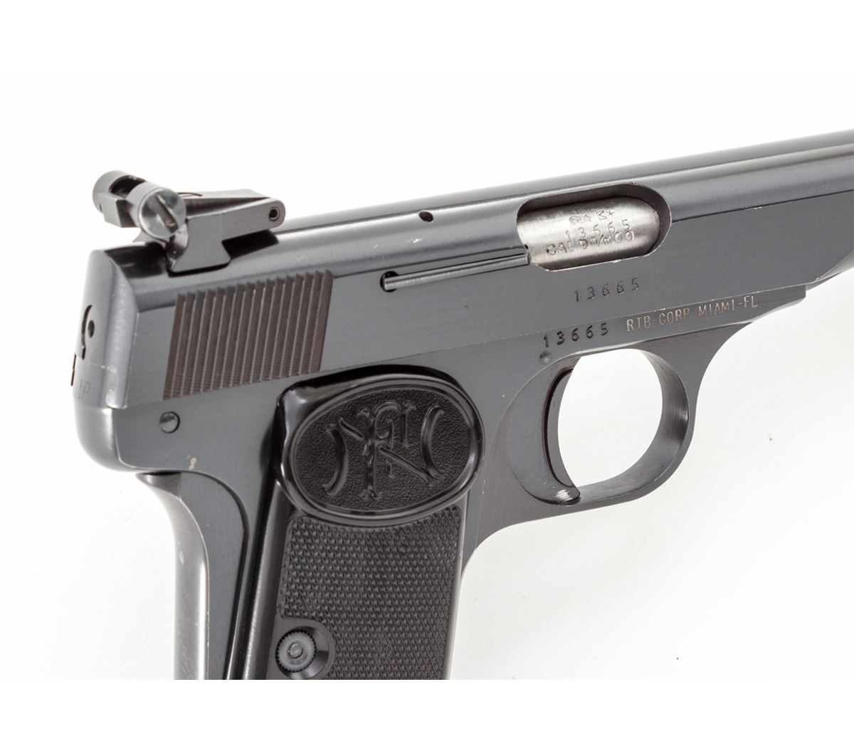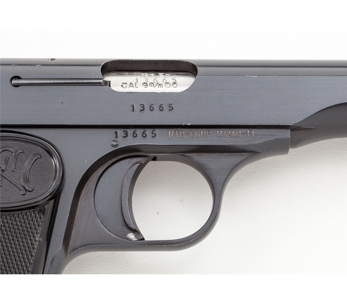 Browning Model 1955 Semi-Automatic Pistol, #13665, .380 cal., 4-1/2'' barrel, blue finish, factory adjustable sights, factory checkered black plastic grips, with two (2) extra magazines. Condition is excellent showing little use, with very light high edgewear at muzzle and wear in actioning areas of trigger. Minor thinning to front and backstrap. Grips and action are crisp. Est.: $450-$600. (Modern/PPT)