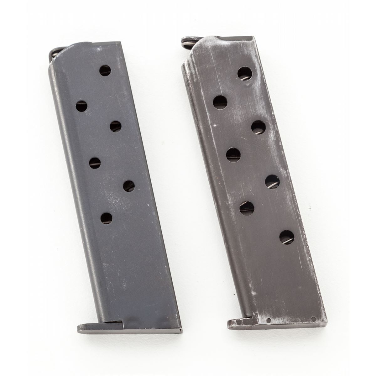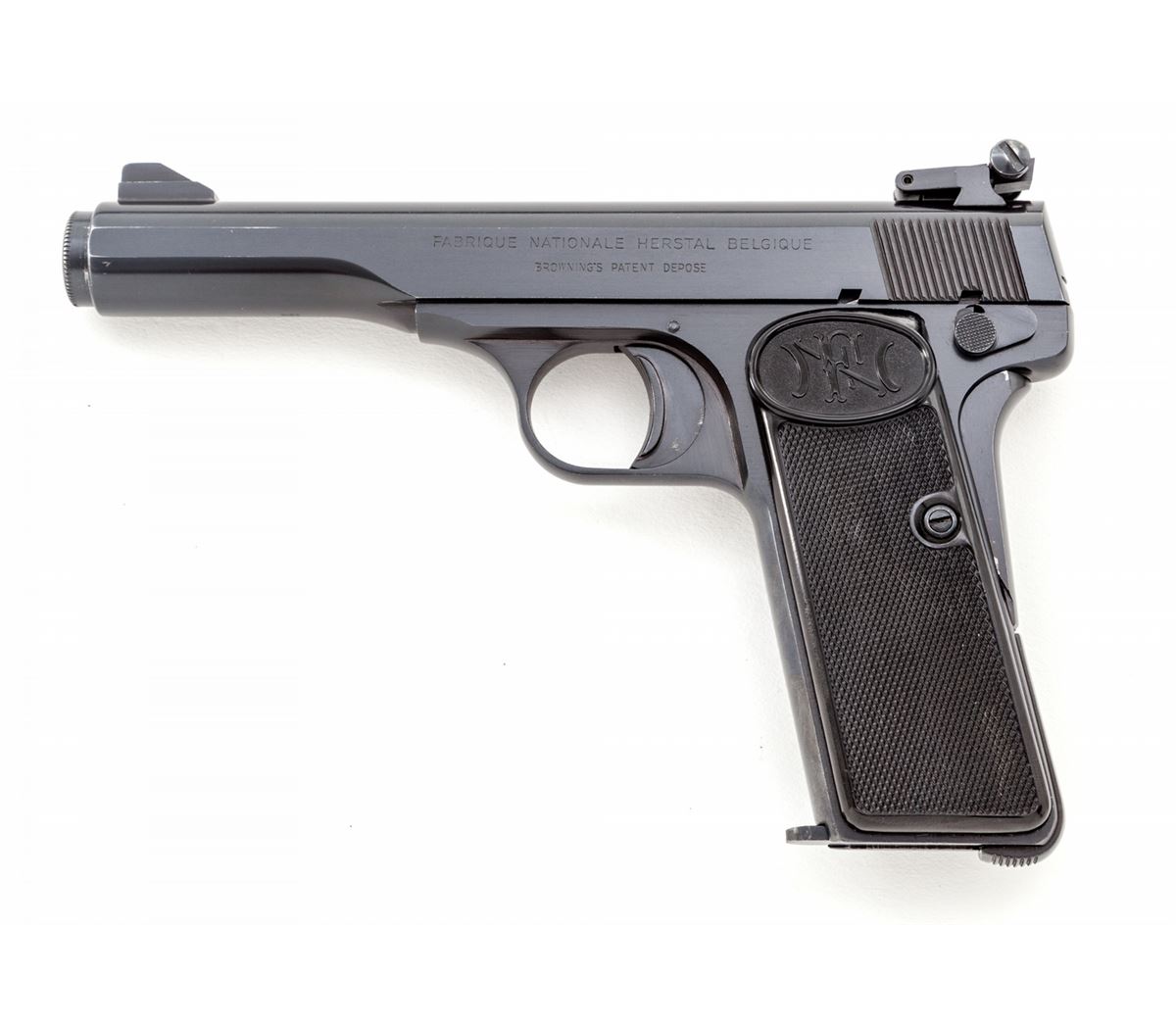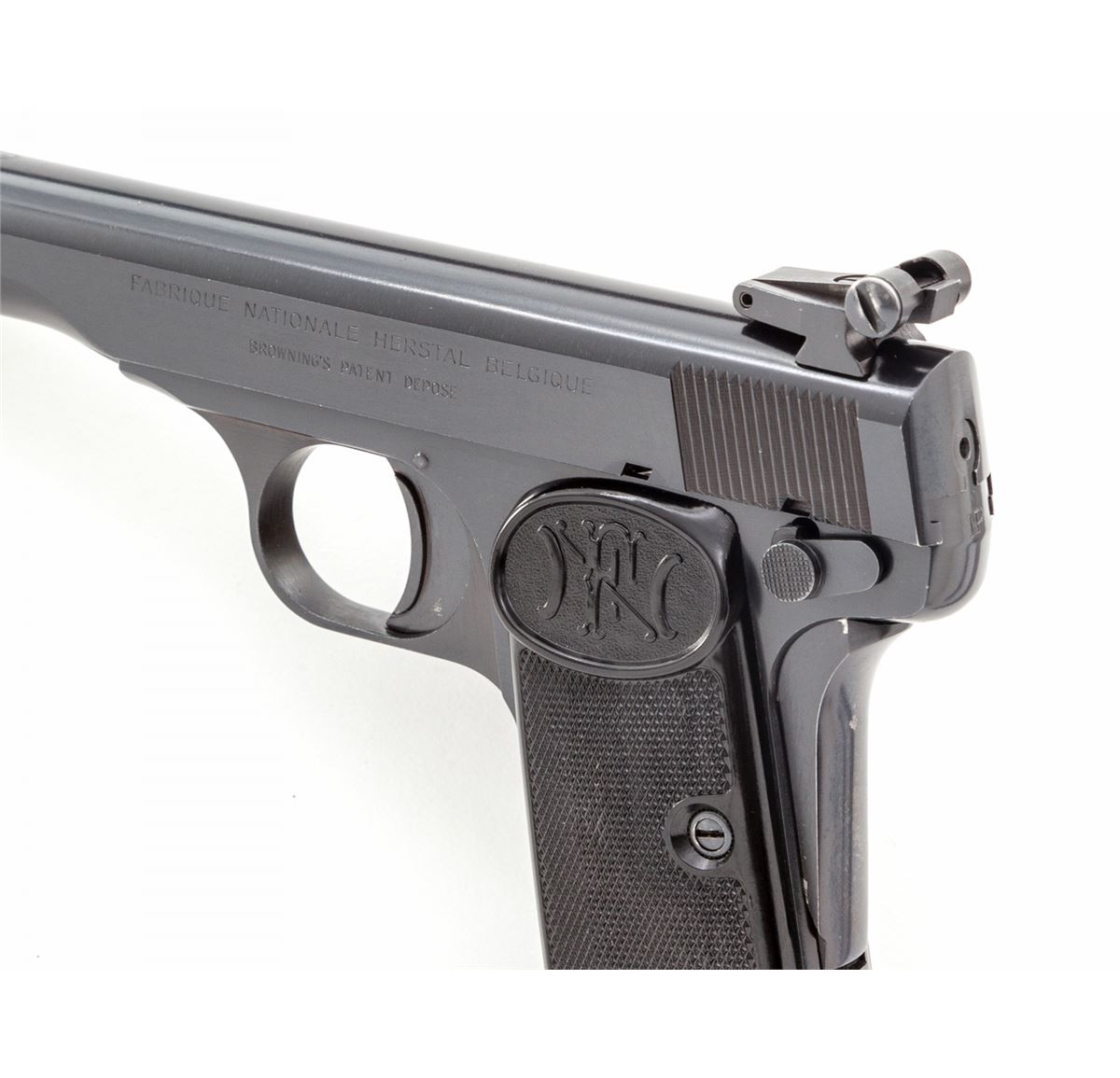 Browning Model 1955 Semi-Automatic Pistol, #13665, .380 cal., 4-1/2'' barrel, blue finish, factory adjustable sights, factory checkered black plastic grips, with two (2) extra magazines. Condition is excellent showing little use, with very light high edgewear at muzzle and wear in actioning areas of trigger. Minor thinning to front and backstrap. Grips and action are crisp. Est.: $450-$600. (Modern/PPT)