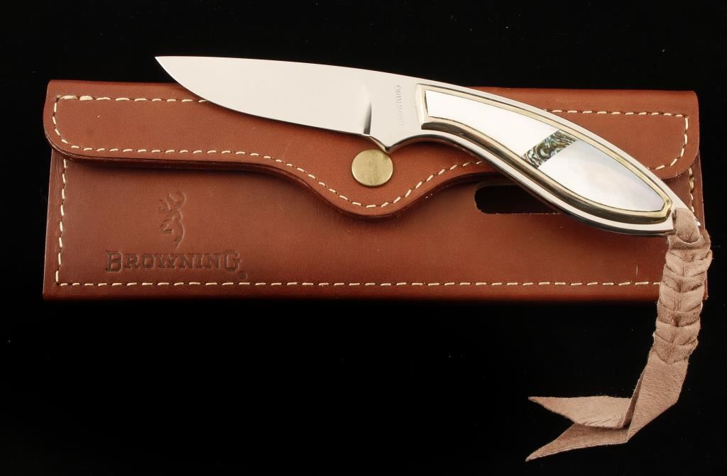 Presentation model in leather case. Handles are Mother-of-Pearl and abalone. Full-tang blade. Overall length is 7". Has a lanyard loop with a braided suede tether installed. Includes a heavy leather folding case for storage and a document. Condition is excellent.