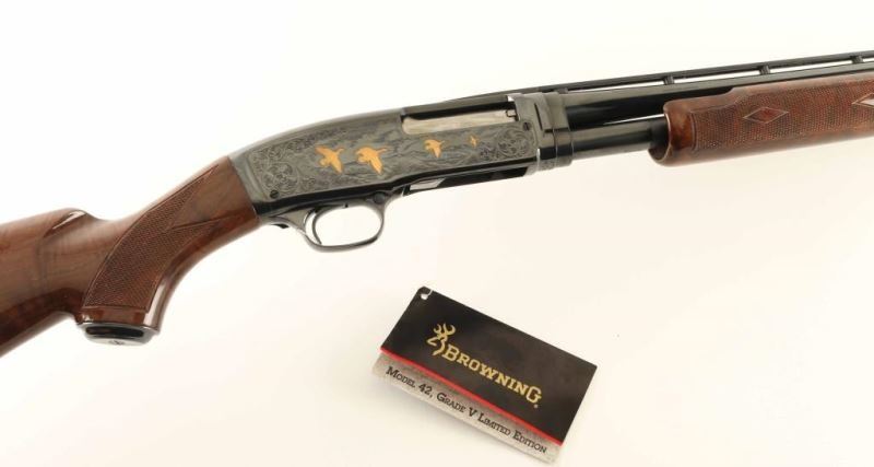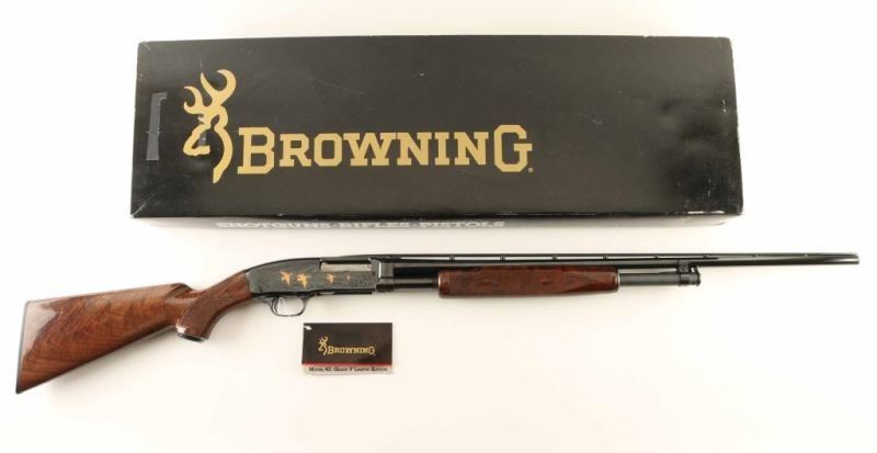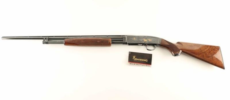 SN: 07593NZ982 Deluxe Limited Edition pump shotgun made in Japan, imported by Browning Arms, Morgan UT. Features high polish blue, fancy figured deluxe walnut stock and pump handle, engraved receiver, 26" vent rib barrel, steel front bead, fixed full choke, accepts up to 3" shells, checkering at wrist & sides of pump handle, curved grip with steel grip cap, flat plastic buttplate. Receiver sides show game scenes with birds and hunting dogs in gold inlay, surrounded by floral scrolls. Bore is excellent condition. Overall condition is near new with few signs of handling. Includes factory box. Condition is NRA Excellent - like new *** Modern Firearm ***